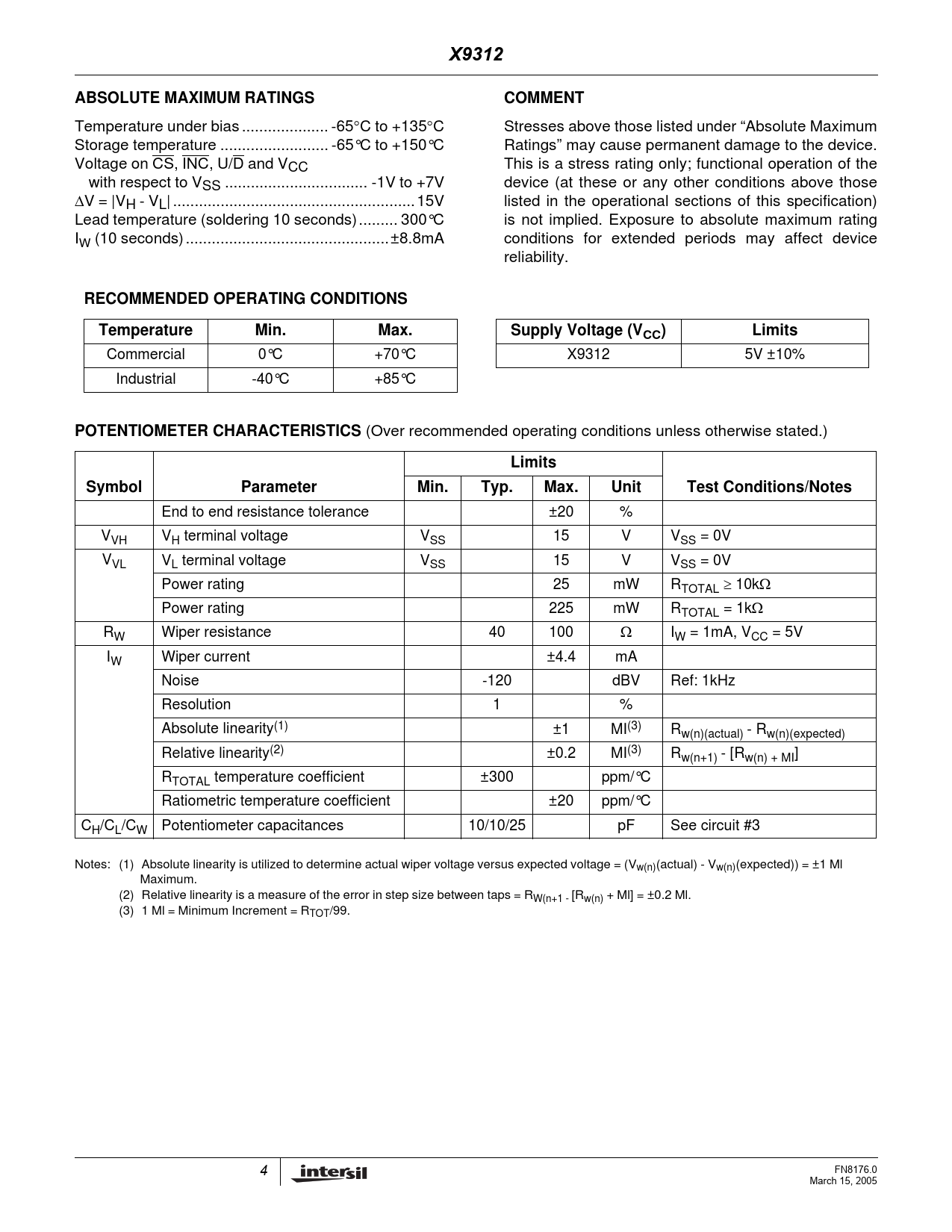 X9312. ABSOLUTE MAXIMUM RATINGS. COMMENT. RECOMMENDED OPERATING CONDITIONS. Temperature. Min. Max. Supply Voltage (VCC). Limits