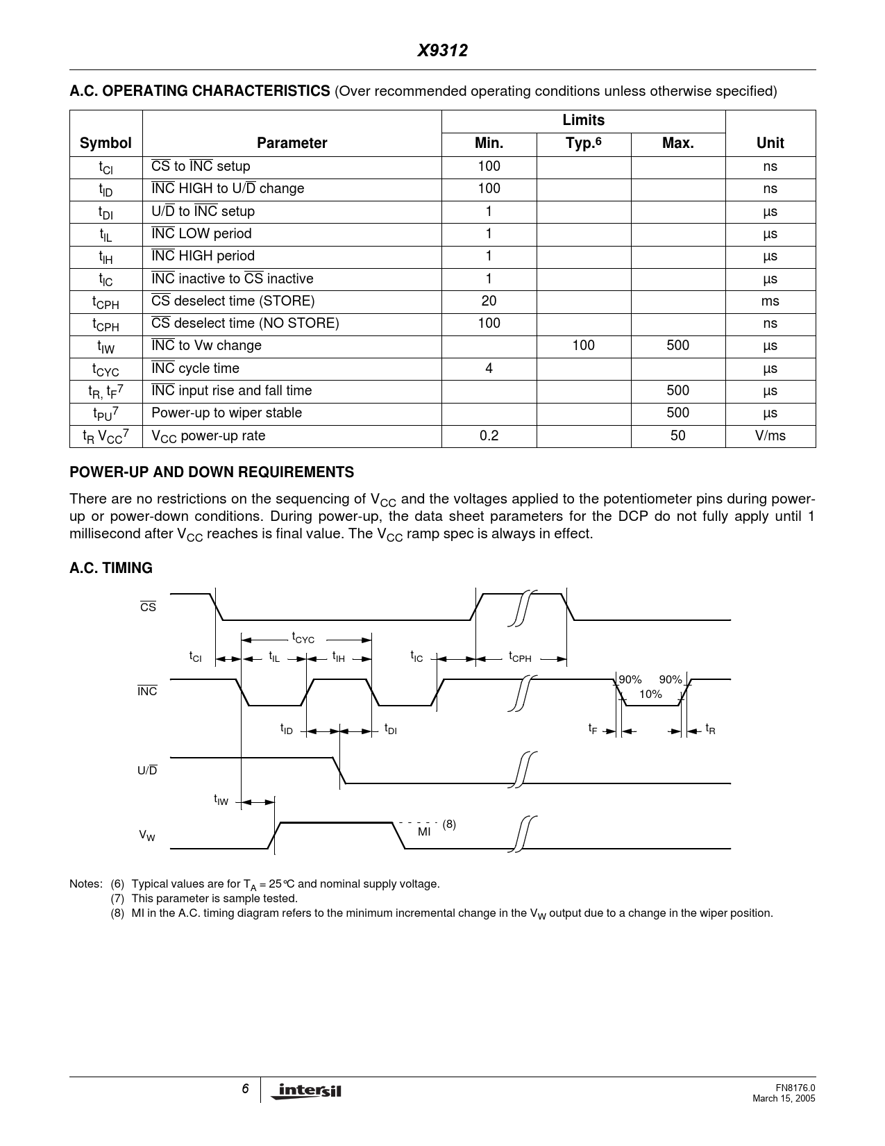 X9312. A.C. OPERATING CHARACTERISTICS. Limits. Symbol. Parameter. Min. Typ.6. Max. Unit. POWER-UP AND DOWN REQUIREMENTS. A.C. TIMING