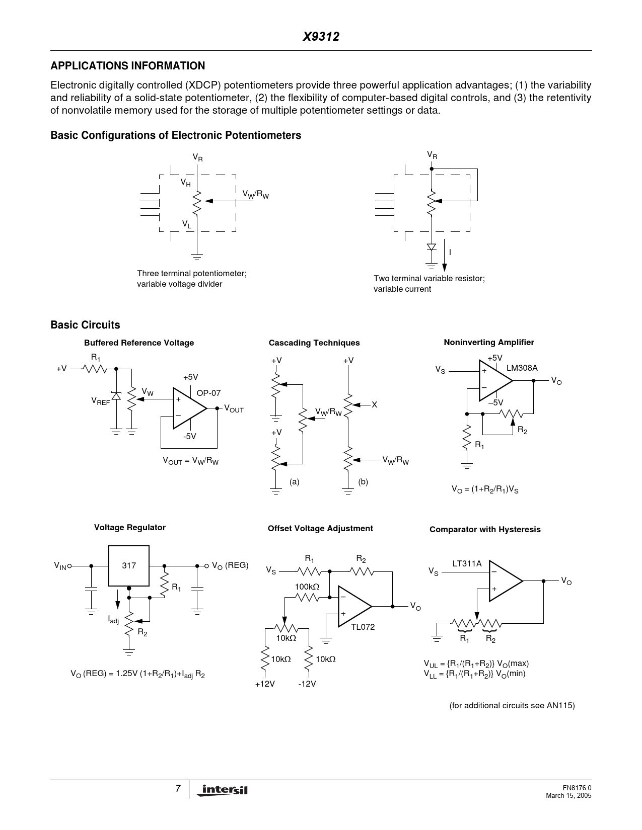 X9312APPLICATIONS INFORMATION Electronic digitally controlled (XDCP) potentiometers provide three powerful application advantages; (1) the variability and reliability of a solid-state potentiometer, (2) the flexibility of computer-based digital controls, and (3) the retentivity of nonvolatile memory used for the storage of multiple potentiometer settings or data. Basic Configurations of Electronic Potentiometers V V R R VH VW/RW VL I Three terminal potentiometer; Two terminal variable resistor; variable voltage divider variable current Basic CircuitsBuffered Reference VoltageCascading TechniquesNoninverting Amplifier R1 +V +V +5V +V V LM308A S + +5V VO – VW OP-07 + VREF –5V V X OUT V – W/RW +V R2 -5V R1 V V OUT = VW/RW W/RW (a) (b) VO = (1+R2/R1)VS Voltage RegulatorOffset Voltage AdjustmentComparator with Hysteresis R R 1 2 V V LT311A IN 317 O (REG) VS V – S V R O 1 100kΩ + – VO + Iadj TL072 } } R2 10kΩ R R 1 2 10kΩ 10kΩ VUL = {R1/(R1+R2)} VO(max) VO (REG) = 1.25V (1+R2/R1)+Iadj R2 VLL = {R1/(R1+R2)} VO(min) +12V -12V (for additional circuits see AN115) 7 FN8176.0 March 15, 2005