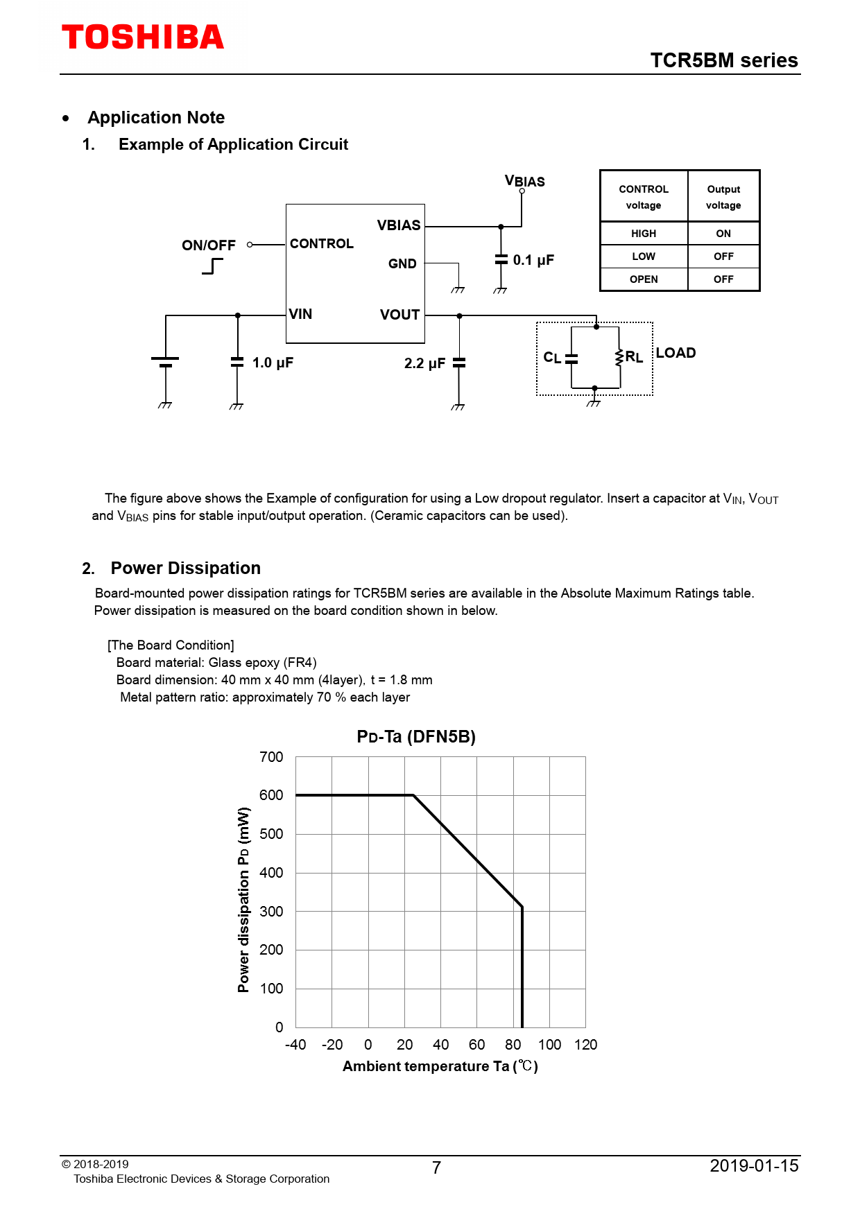 TCR5BM series. Application Note. 1. Example of Application Circuit. VBIAS. CONTROL. Output. voltage. HIGH. ON/OFF. 0.1 μF. LOW. OFF. GND. OPEN. VIN