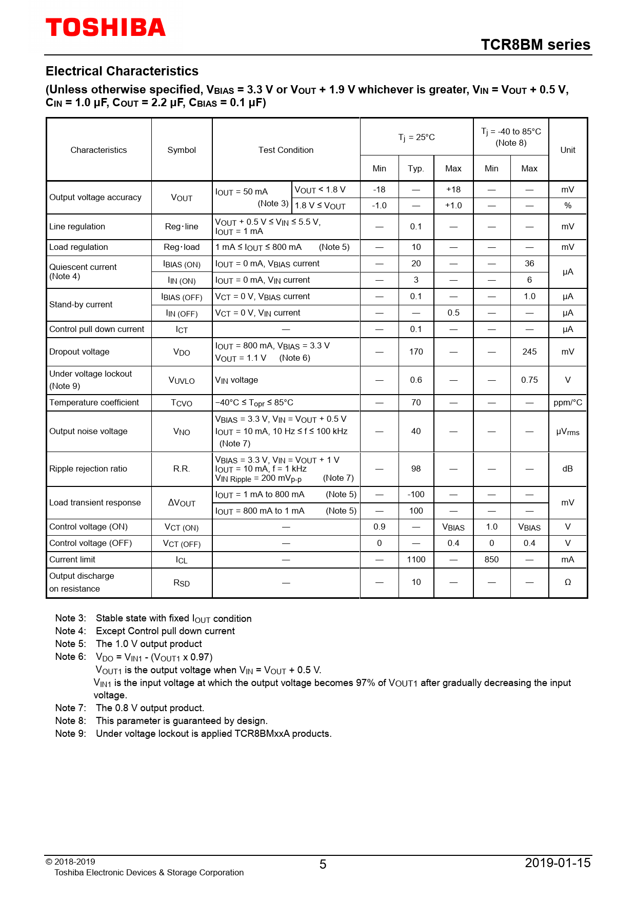 TCR8BM series Electrical Characteristics (Unless otherwise specified, VBIAS = 3.3 V or VOUT + 1.9 V whichever is greater, VIN = VOUT + 0.5 V, CIN = 1.0 μF, COUT = 2.2 μF, CBIAS = 0.1 μF)