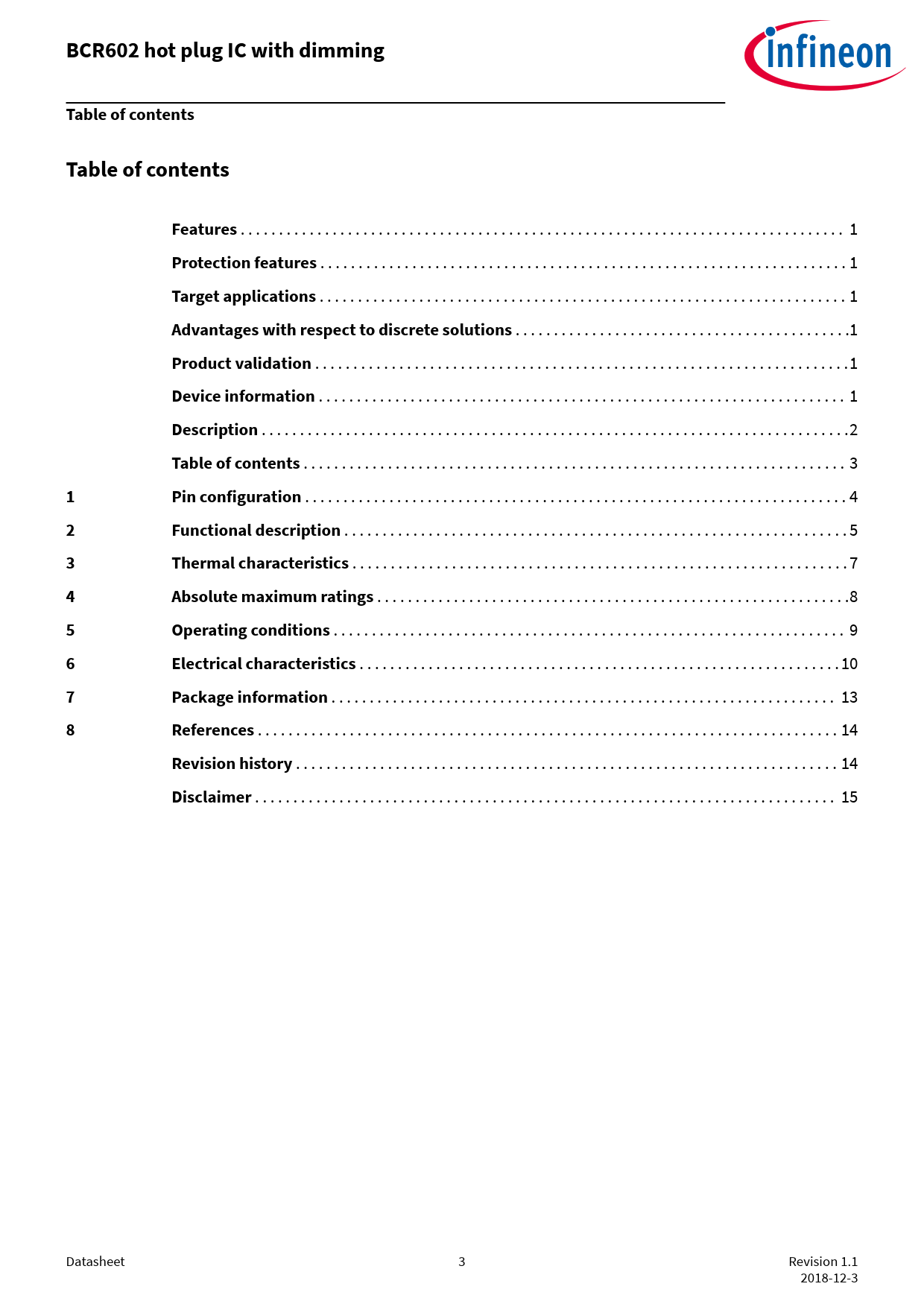 link to page 1 link to page 1 link to page 1 link to page 1 link to page 1 link to page 1 link to page 2 link to page 3 link to page 4 link to page 5 link to page 7 link to page 8 link to page 9 link to page 10 link to page 13 link to page 14 link to page 14 link to page 15 BCR602 hot plug IC with dimmingTable of contentsTable of contentsFeatures . 1 Protection features . 1 Target applications . 1 Advantages with respect to discrete solutions . .1 Product validation . .1 Device information . 1 Description . .2 Table of contents . 3 1Pin configuration . 4 2Functional description . 5 3Thermal characteristics . 7 4Absolute maximum ratings . .8 5Operating conditions . 9 6Electrical characteristics . .10 7Package information . 13 8References . 14 Revision history . 14 Disclaimer . 15 Datasheet 3 Revision 1.1 2018-12-3 Document Outline Features Protection features Target applications Advantages with respect to discrete solutions Product validation Device information Description Table of contents 1 Pin configuration 2 Functional description 3 Thermal characteristics 4 Absolute maximum ratings 5 Operating conditions 6 Electrical characteristics 7 Package information 8 References Revision history Disclaimer