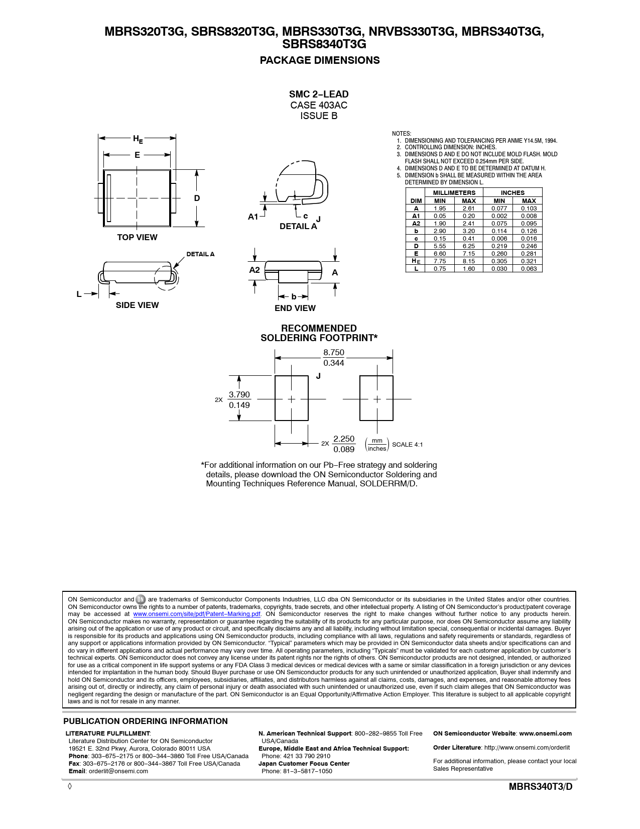 MBRS320T3G, SBRS8320T3G, MBRS330T3G, NRVBS330T3G, MBRS340T3G,. SBRS8340T3G. PACKAGE DIMENSIONS. SMC 2−LEAD. MILLIMETERS. INCHES