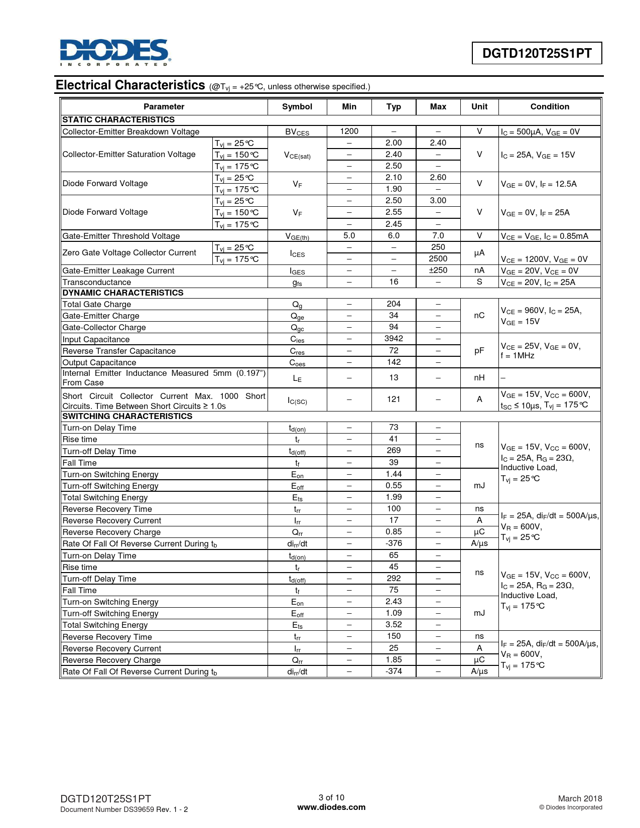 Turn-on Delay Time td(on) – 73 – Rise time tr – 41 – ns VGE = 15V, VCC = 600V, Turn-off Delay Time td(off) – 269 – IC = 25A, RG = 23Ω, Fall Time tf – 39 – Inductive Load, Turn-on Switching Energy Eon – 1.44 – Tvj = 25°C Turn-off Switching Energy Eoff – 0.55 – mJ Total Switching Energy Ets – 1.99 – Reverse Recovery Time trr – 100 – ns IF = 25A, diF/dt = 500A/µs, Reverse Recovery Current Irr – 17 – A VR = 600V, Reverse Recovery Charge Qrr – 0.85 – µC Tvj = 25°C Rate Of Fall Of Reverse Current During tb dirr/dt – -376 – A/µs Turn-on Delay Time td(on) – 65 – Rise time tr – 45 – ns VGE = 15V, VCC = 600V, Turn-off Delay Time td(off) – 292 – IC = 25A, RG = 23Ω, Fall Time tf – 75 – Inductive Load, Turn-on Switching Energy Eon – 2.43 – Tvj = 175°C Turn-off Switching Energy Eoff – 1.09 – mJ Total Switching Energy Ets – 3.52 – Reverse Recovery Time trr – 150 – ns IF = 25A, diF/dt = 500A/µs, Reverse Recovery Current Irr – 25 – A VR = 600V, Reverse Recovery Charge Qrr – 1.85 – µC Tvj = 175°C Rate Of Fall Of Reverse Current During tb dirr/dt – -374 – A/µs DGTD120T25S1PT 3 of 10 March 2018 Document Number DS39659 Rev. 1 - 2