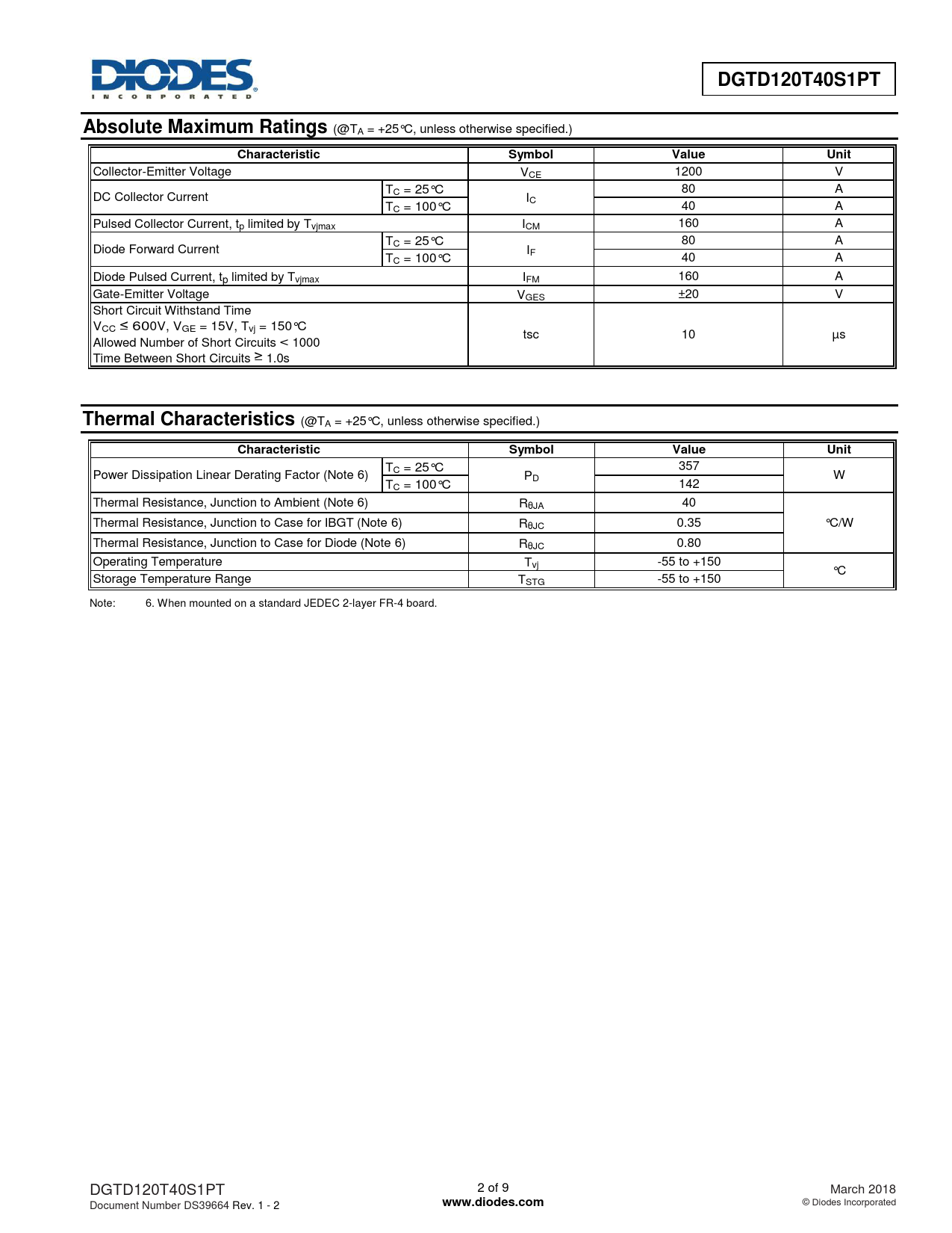 357 Power Dissipation Linear Derating Factor (Note 6) TC = 25°C PD W TC = 100°C 142 Thermal Resistance, Junction to Ambient (Note 6) RθJA 40 Thermal Resistance, Junction to Case for IBGT (Note 6) RθJC 0.35 °C/W Thermal Resistance, Junction to Case for Diode (Note 6) RθJC 0.80 Operating Temperature Tvj -55 to +150 °C Storage Temperature Range TSTG -55 to +150 Note: 6. When mounted on a standard JEDEC 2-layer FR-4 board. DGTD120T40S1PT 2 of 9 March 2018 Document Number DS39664 Rev. 1 - 2