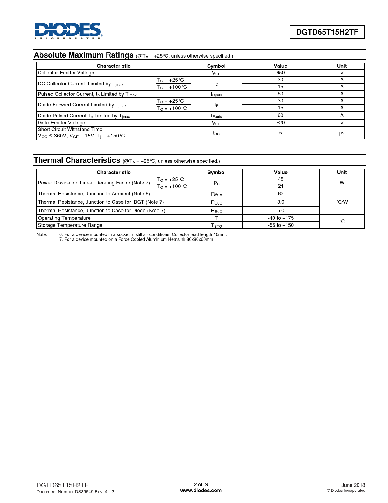 DGTD65T15H2TF. Absolute Maximum Ratings. Characteristic. Symbol. Value. Unit. Thermal Characteristics. www.diodes.com