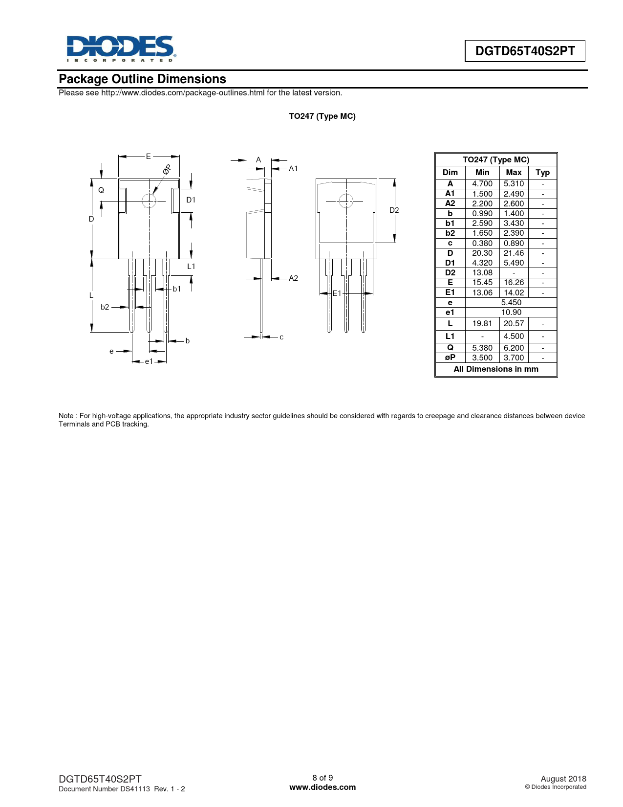 DGTD65T40S2PT. Package Outline Dimensions. TO247 (Type MC). Dim. Min. Max. Typ. All Dimensions in mm. www.diodes.com