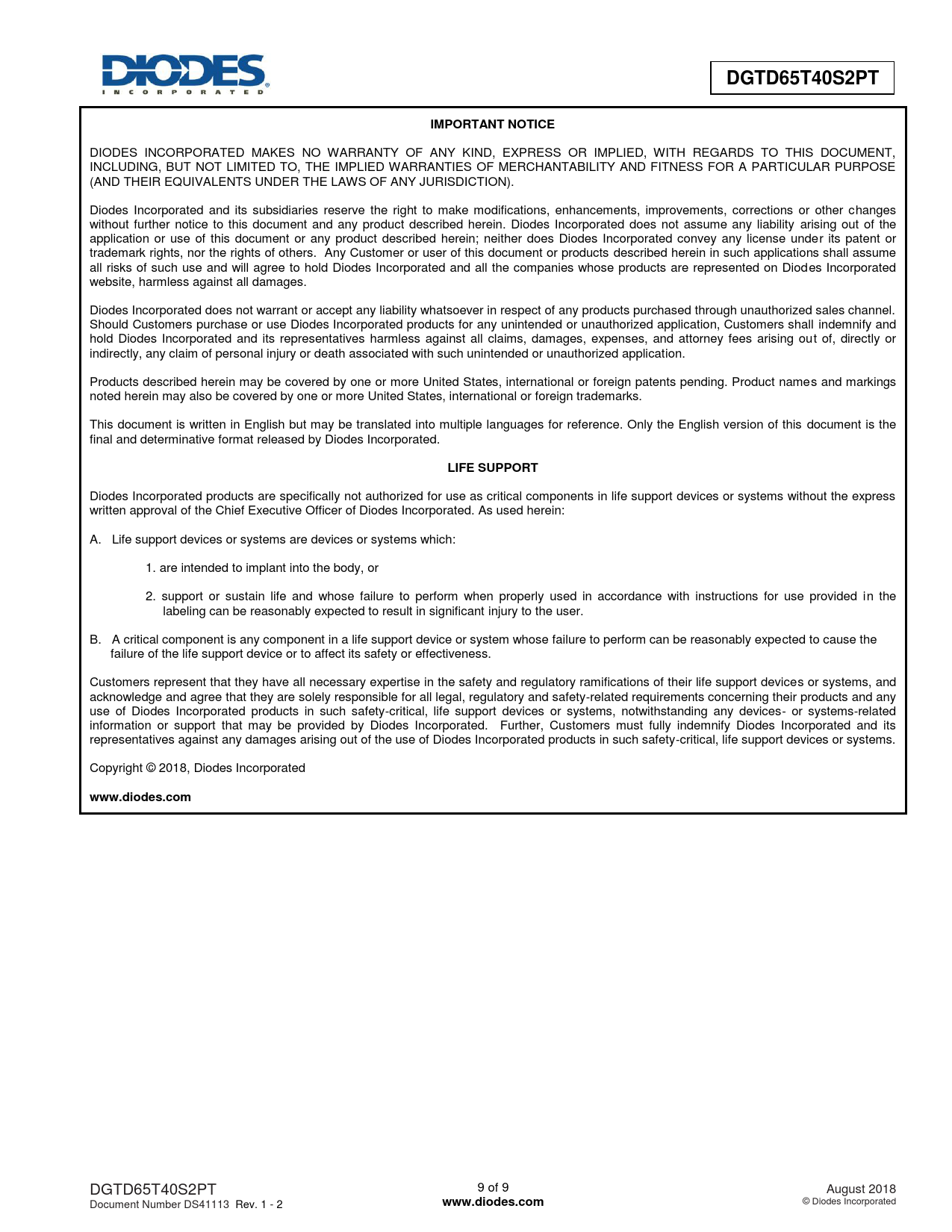 | Seiten / Seite | 9 / 9 — DGTD65T40S2PT. IMPORTANT NOTICE. LIFE SUPPORT. www.diodes.com |