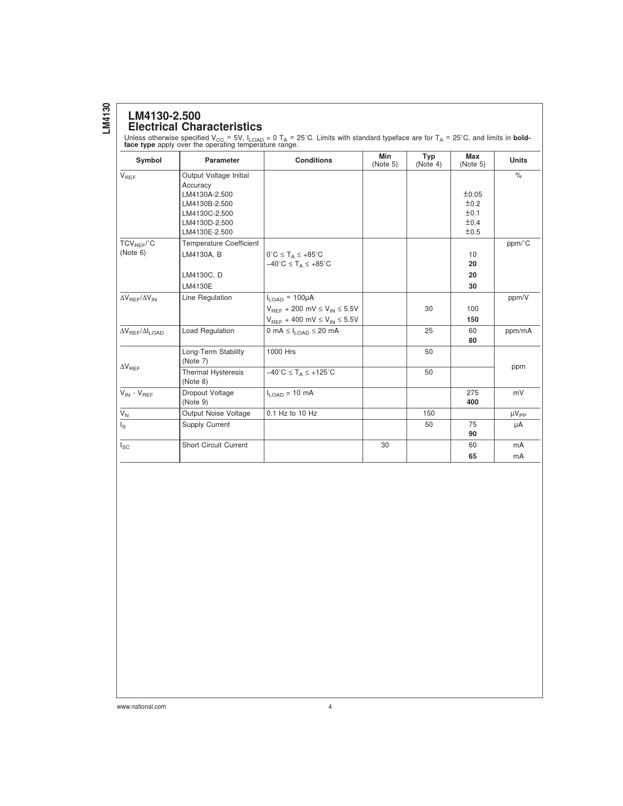 LM4130-2.500 Electrical CharacteristicsLM4130 Unless otherwise specified V = 5V, I = 0 T = 25˚C. Limits with standard typeface are for T = 25˚C, and limits in bold- CC LOAD A A face type apply over the operating temperature range. MinTypMaxSymbolParameterConditionsUnits (Note 5) (Note 4) (Note 5) V Output Voltage Initial % REF Accuracy LM4130A-2.500 ±0.05 LM4130B-2.500 ±0.2 LM4130C-2.500 ±0.1 LM4130D-2.500 ±0.4 LM4130E-2.500 ±0.5 TCV /˚C Temperature Coefficient ppm/˚C REF (Note 6) LM4130A, B 0˚C ≤ T ≤ +85˚C 10 A −40˚C ≤ T ≤ +85˚C 20 A LM4130C, D 20 LM4130E 30 ∆V /∆V Line Regulation I = 100µA ppm/V REF IN LOAD V + 200 mV ≤ V ≤ 5.5V 30 100 REF IN V + 400 mV ≤ V ≤ 5.5V 150 REF IN ∆V /∆I Load Regulation 0 mA ≤ I ≤ 20 mA 25 60 ppm/mA REF LOAD LOAD 80 Long-Term Stability 1000 Hrs 50 (Note 7) ∆V ppm REF Thermal Hysteresis −40˚C ≤ T ≤ +125˚C 50 A (Note 8) V - V Dropout Voltage I = 10 mA 275 mV IN REF LOAD (Note 9) 400 V Output Noise Voltage 0.1 Hz to 10 Hz 150 µV N PP I Supply Current 50 75 µA S 90 I Short Circuit Current 30 60 mA SC 65 mA www.national.com 4