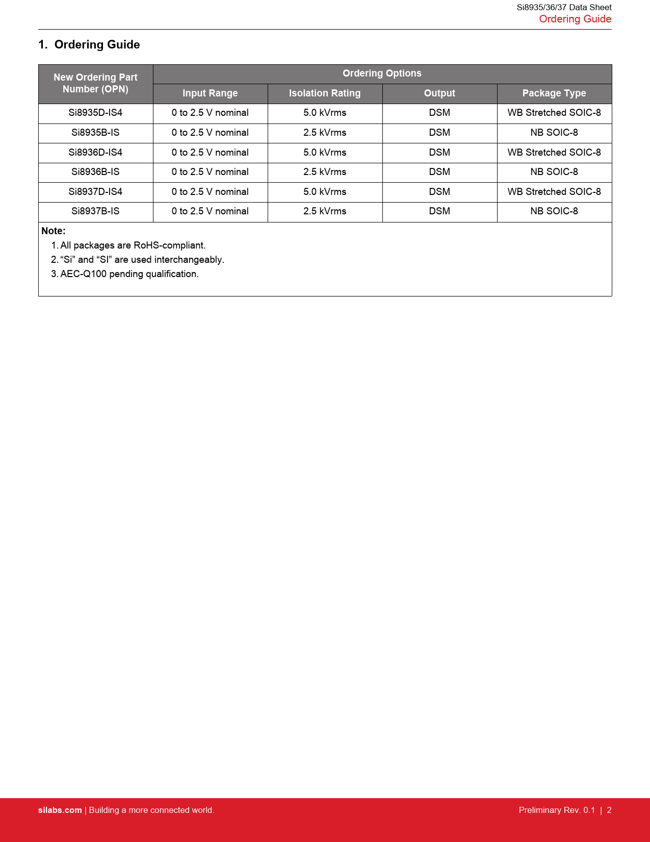 | Building a more connected world. Preliminary Rev. 0.1 | 2 Document Outline 1. Ordering Guide 2. System Overview 2.1 Modulator 3. Voltage Sense Application 4. Electrical Specifications 4.1 Regulatory Information 5. Pin Descriptions 5.1 Si8935/36/37 Pin Descriptions 6. Packaging 6.1 Package Outline: 8-Pin Wide Body Stretched SOIC 6.2 Package Outline: 8-Pin Narrow Body SOIC 6.3 Land Pattern: 8-Pin Wide Body Stretched SOIC 6.4 Land Pattern: 8-Pin Narrow Body SOIC 6.5 Top Marking: 8-Pin Wide Body Stretched SOIC 6.6 Top Marking: 8-Pin Narrow Body SOIC 7. Document Revision History