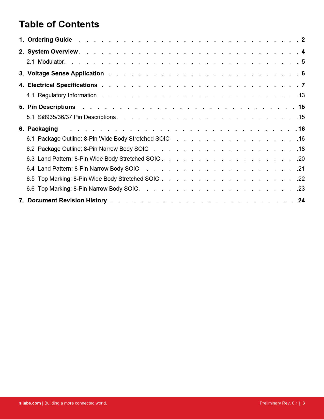 link to page 2 link to page 2 link to page 4 link to page 4 link to page 5 link to page 5 link to page 6 link to page 6 link to page 7 link to page 7 link to page 13 link to page 13 link to page 15 link to page 15 link to page 15 link to page 15 link to page 16 link to page 16 link to page 16 link to page 16 link to page 18 link to page 18 link to page 20 link to page 20 link to page 21 link to page 21 link to page 22 link to page 22 link to page 23 link to page 23 link to page 24 link to page 24 Table of Contents1. Ordering Guide. 22. System Overview. 4 2.1 Modulator. 5 3. Voltage Sense Application. 64. Electrical Specifications. 7 4.1 Regulatory Information . .13 5. Pin Descriptions. 15 5.1 Si8935/36/37 Pin Descriptions . .15 6. Packaging. 16 6.1 Package Outline: 8-Pin Wide Body Stretched SOIC . .16 6.2 Package Outline: 8-Pin Narrow Body SOIC . .18 6.3 Land Pattern: 8-Pin Wide Body Stretched SOIC . .20 6.4 Land Pattern: 8-Pin Narrow Body SOIC . .21 6.5 Top Marking: 8-Pin Wide Body Stretched SOIC . .22 6.6 Top Marking: 8-Pin Narrow Body SOIC . .23 7. Document Revision History. 24silabs.com | Building a more connected world. Preliminary Rev. 0.1 | 3 Document Outline 1. Ordering Guide 2. System Overview 2.1 Modulator 3. Voltage Sense Application 4. Electrical Specifications 4.1 Regulatory Information 5. Pin Descriptions 5.1 Si8935/36/37 Pin Descriptions 6. Packaging 6.1 Package Outline: 8-Pin Wide Body Stretched SOIC 6.2 Package Outline: 8-Pin Narrow Body SOIC 6.3 Land Pattern: 8-Pin Wide Body Stretched SOIC 6.4 Land Pattern: 8-Pin Narrow Body SOIC 6.5 Top Marking: 8-Pin Wide Body Stretched SOIC 6.6 Top Marking: 8-Pin Narrow Body SOIC 7. Document Revision History