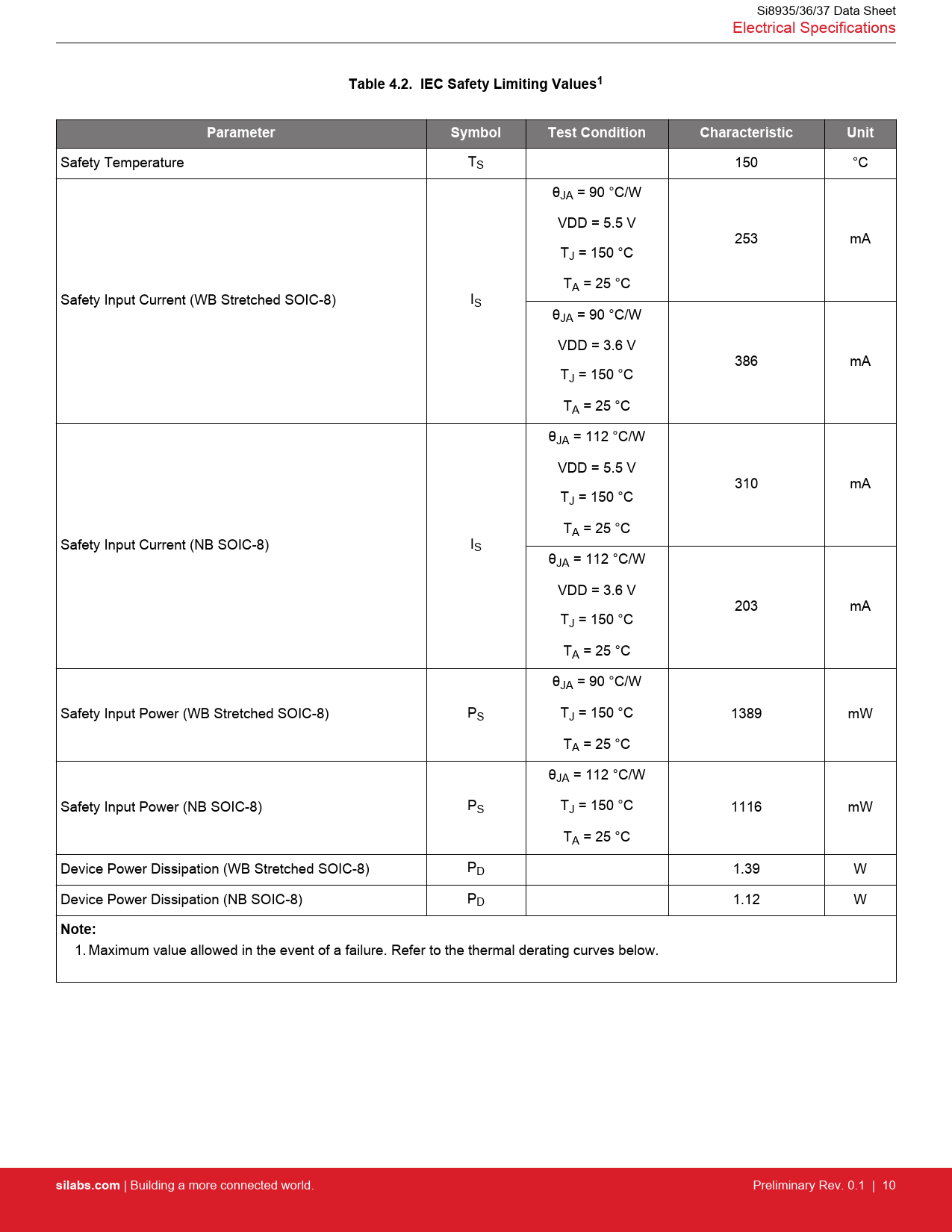 link to page 10 Si8935/36/37 Data Sheet Electrical Specifications Table 4.2. IEC Safety Limiting Values1ParameterSymbolTest ConditionCharacteristicUnit Safety Temperature TS 150 °C θJA = 90 °C/W VDD = 5.5 V 253 mA TJ = 150 °C TA = 25 °C Safety Input Current (WB Stretched SOIC-8) IS θJA = 90 °C/W VDD = 3.6 V 386 mA TJ = 150 °C TA = 25 °C θJA = 112 °C/W VDD = 5.5 V 310 mA TJ = 150 °C TA = 25 °C Safety Input Current (NB SOIC-8) IS θJA = 112 °C/W VDD = 3.6 V 203 mA TJ = 150 °C TA = 25 °C θJA = 90 °C/W Safety Input Power (WB Stretched SOIC-8) PS TJ = 150 °C 1389 mW TA = 25 °C θJA = 112 °C/W Safety Input Power (NB SOIC-8) PS TJ = 150 °C 1116 mW TA = 25 °C Device Power Dissipation (WB Stretched SOIC-8) PD 1.39 W Device Power Dissipation (NB SOIC-8) PD 1.12 W Note: 1. Maximum value allowed in the event of a failure. Refer to the thermal derating curves below. silabs.com | Building a more connected world. Preliminary Rev. 0.1 | 10 Document Outline 1. Ordering Guide 2. System Overview 2.1 Modulator 3. Voltage Sense Application 4. Electrical Specifications 4.1 Regulatory Information 5. Pin Descriptions 5.1 Si8935/36/37 Pin Descriptions 6. Packaging 6.1 Package Outline: 8-Pin Wide Body Stretched SOIC 6.2 Package Outline: 8-Pin Narrow Body SOIC 6.3 Land Pattern: 8-Pin Wide Body Stretched SOIC 6.4 Land Pattern: 8-Pin Narrow Body SOIC 6.5 Top Marking: 8-Pin Wide Body Stretched SOIC 6.6 Top Marking: 8-Pin Narrow Body SOIC 7. Document Revision History
