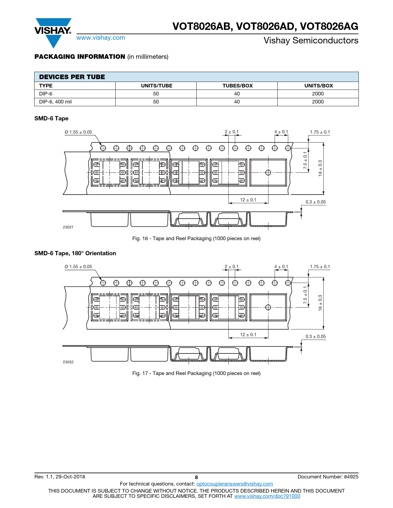 VOT8026AB, VOT8026AD, VOT8026AG. PACKAGING INFORMATION. DEVICES PER TUBE TYPE. UNITS/TUBE. TUBES/BOX. UNITS/BOX. SMD-6 Tape