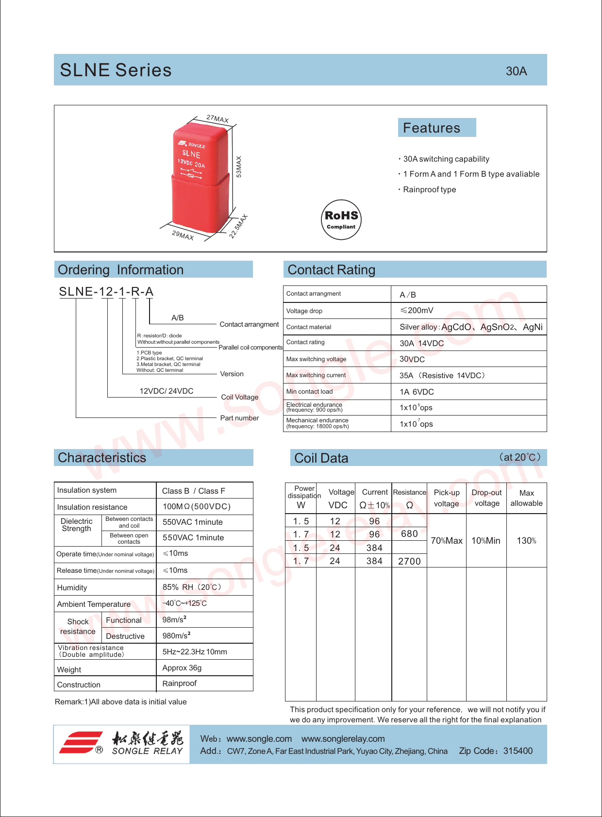 SLNE. Series. 30A. 27MAX. Features. X. ·30A. switching. capability. A. M. 3. 5. ·1. Form. A. and. 1. Form. B. type. avaliable. ·Rainproof. type. X. A. M. 2. .5. 9MA. 2. X. 2. Ordering