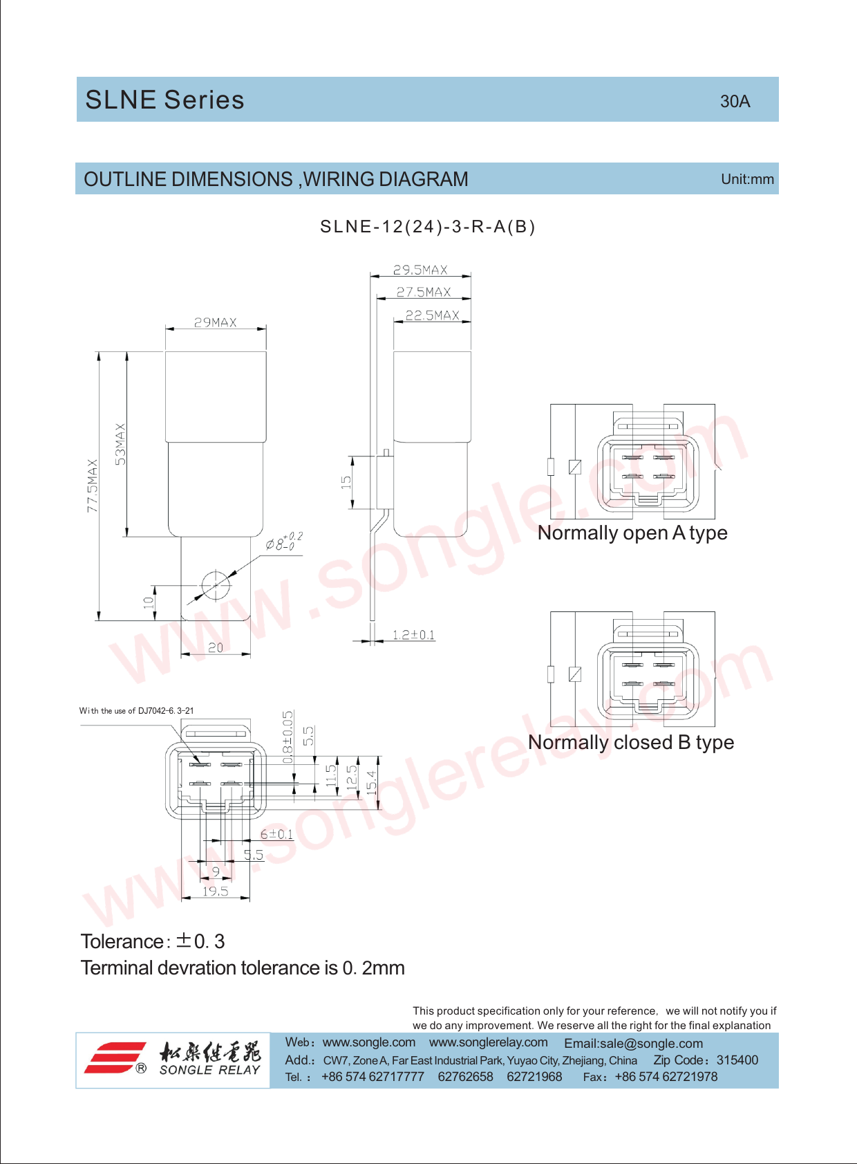 SLNE Series 30A OUTLINE DIMENSIONS ,WIRING DIAGRAM Unit:mm S L N E - 1 2 ( 2 4 ) - 3 - R - A ( B ) Normally open A type With the use of DJ7042-6.3-21 Normally closed B type Tolerance:±0.3 Terminal devration tolerance is 0.2mm This product specification only for your reference, we will not notify you if we do any improvement.We reserve all the right for the final explanation Web:www.songle.com www.songlerelay.com Email:sale@songle.com Add.:CW7, Zone A, Far East Industrial Park, Yuyao City, Zhejiang, China i Z p Code:315400 Tel.: +86 574 62717777 62762658 62721968 a F x:+86 574 62721978 Document Outline 页 1 页 2 页 3
