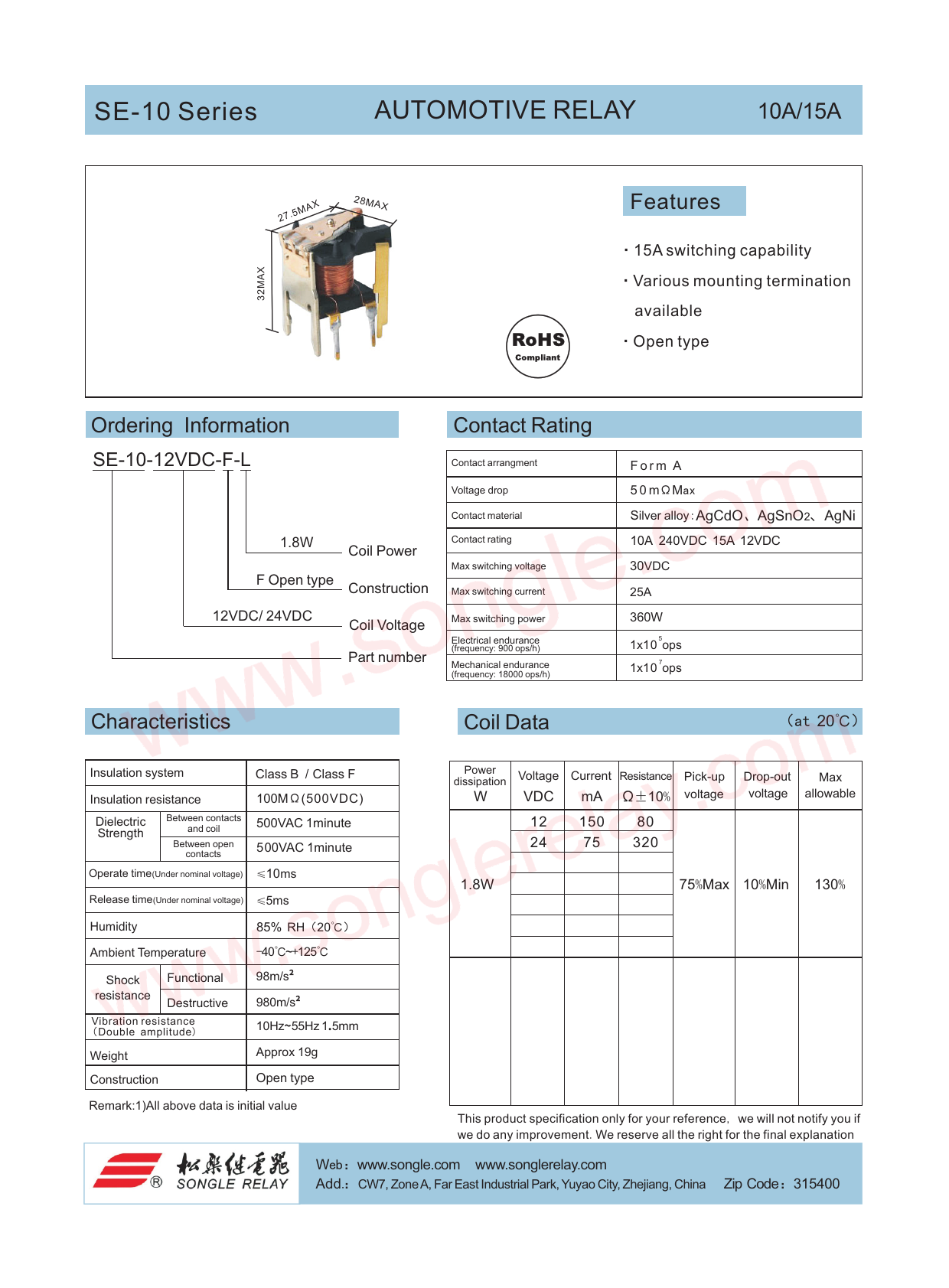 SE-10 Series AUTOMOTIVE RELAY 10A/15A 28MAX Features 27.5MAX ·15A switching capability X A · M Various mounting termination 2 3 available ·Open type Ordering Information Contact Rating SE-10-12VDC-F-L Contact arrangment F o r m A Voltage drop 5 0 mΩMax Contact material Silver alloy:AgCdO、AgSnO2、AgNi Contact rating 10A 240VDC 15A 12VDC 1.8W Coil Power Max switching voltage 30VDC F Open type Construction Max switching current 25A 12VDC/ 24VDC Max switching power 360W Coil Voltage 5 Electrical endurance 1x10 ops (frequency: 900 ops/h) Part number 7 endurance Mechanical 1x10 ops (frequency: 18000 ops/h) Characteristics Coil Data ( 20 at ℃) Insulation system Class B / Class F Power Voltage Current Resistance dissipation Pick-up Drop-out Max Insulation resistance 100MΩ(500VDC) W VDC mA ± Ω 10% voltage voltage allowable Dielectric Between contacts 500VAC 1minute 12 150 80 Strength and coil Between open 500VAC 1minute 24 75 320 contacts Operate time(Under nominal voltage) ≤10ms 1.8W 75%Max 10%Min 130% Release time(Under nominal voltage) ≤5ms Humidity 85% RH(20℃) Ambient Temperature -40℃~+125℃ Functional 98m/s ² Shock resistance Destructive 980m/s ² Vibration resistance 10Hz ~ 55Hz 1 . 5mm ( Double amplitude) Approx 19g Weight Construction Open type Remark:1)All above data is initial value This product specification only for your reference, we will not notify you if we do any improvement.We reserve all the right for the final explanation Web:www.songle.com www.songlerelay.com Add.:CW7, Zone A, Far East Industrial Park, Yuyao City, Zhejiang, China Zip Code:315400 Document Outline 页 1 页 2