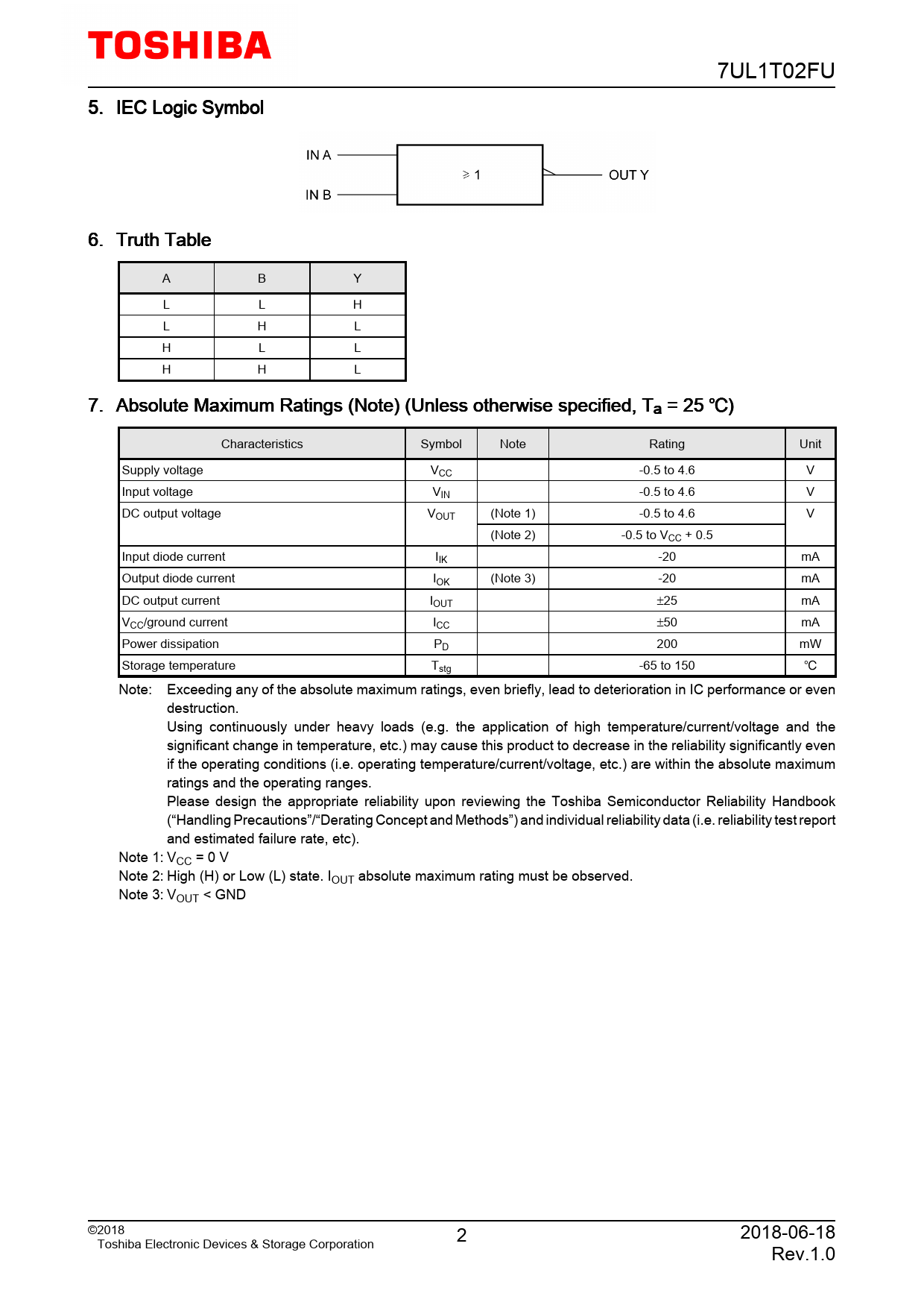 7UL1T02FU. 5. IEC. Logic. Symbol. 6. Truth. Table. A. B. Y. L. L. H. L. H. L. H. L. L. H. H. L. 7. Absolute. Maximum. Ratings. (Note). (Unless. otherwise. specified,. Ta. =. 25. )