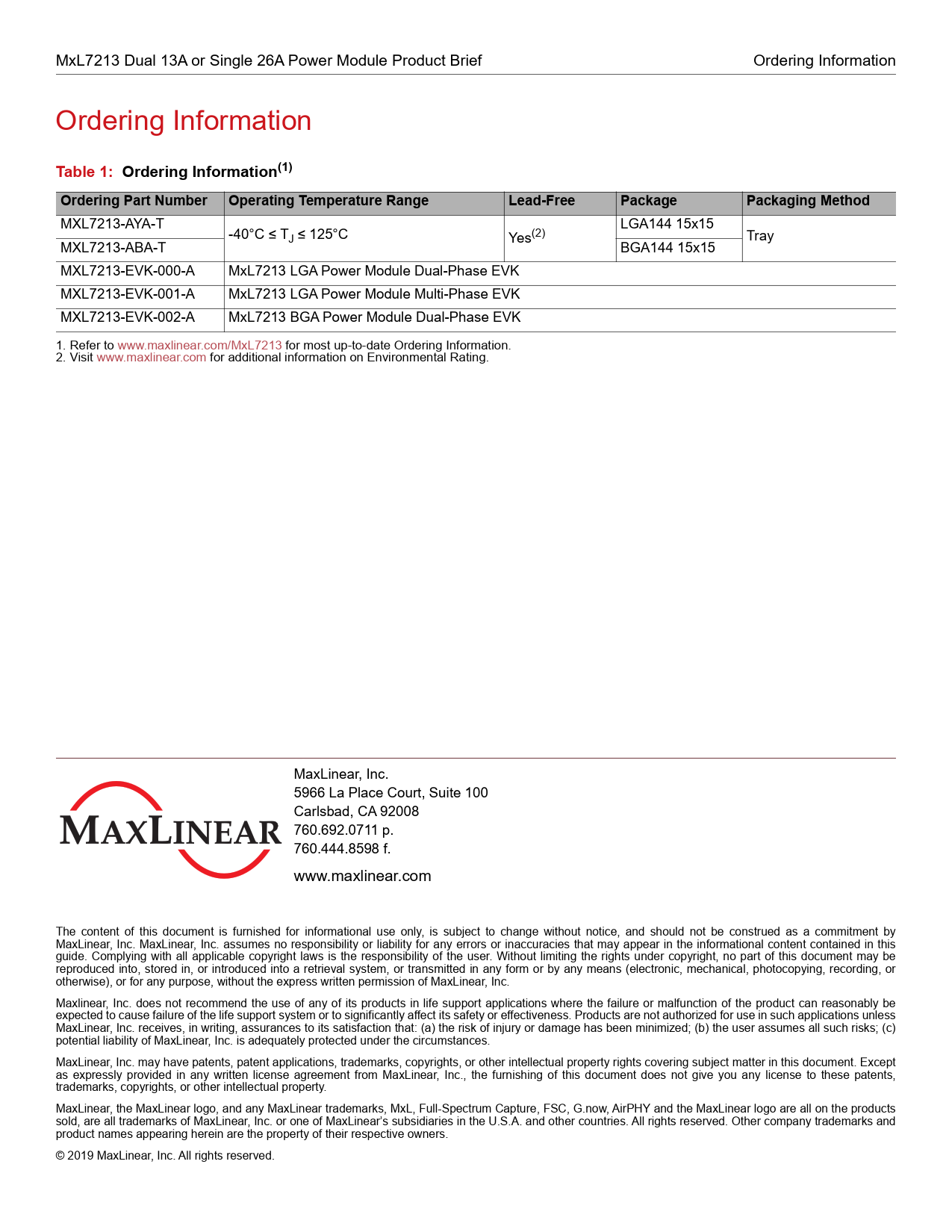 MXL7213-AYA-T LGA144 15x15 -40°C ≤ TJ ≤ 125°C Yes(2) Tray MXL7213-ABA-T BGA144 15x15 MXL7213-EVK-000-A MxL7213 LGA Power Module Dual-Phase EVK MXL7213-EVK-001-A MxL7213 LGA Power Module Multi-Phase EVK MXL7213-EVK-002-A MxL7213 BGA Power Module Dual-Phase EVK 1. Refer to www.maxlinear.com/MxL7213 for most up-to-date Ordering Information. 2. Visit www.maxlinear.com for additional information on Environmental Rating. MaxLinear, Inc. 5966 La Place Court, Suite 100 Carlsbad, CA 92008 760.692.0711 p. 760.444.8598 f. www.maxlinear.com The content of this document is furnished for informational use only, is subject to change without notice, and should not be construed as a commitment by MaxLinear, Inc. MaxLinear, Inc. assumes no responsibility or liability for any errors or inaccuracies that may appear in the informational content contained in this guide. Complying with al applicable copyright laws is the responsibility of the user. Without limiting the rights under copyright, no part of this document may be reproduced into, stored in, or introduced into a retrieval system, or transmit ed in any form or by any means (electronic, mechanical, photocopying, recording, or otherwise), or for any purpose, without the express written permission of MaxLinear, Inc. Maxlinear, Inc. does not recommend the use of any of its products in life support applications where the failure or malfunction of the product can reasonably be expected to cause failure of the life support system or to significantly af ect its safety or ef ectiveness. Products are not authorized for use in such applications unless MaxLinear, Inc. receives, in writing, assurances to its satisfaction that: (a) the risk of injury or damage has been minimized; (b) the user assumes al such risks; (c) potential liability of MaxLinear, Inc. is adequately protected under the circumstances. MaxLinear, Inc. may have patents, patent applications, trademarks, copyrights, or other intel ectual property rights covering subject matter in this document. Except as expressly provided in any written license agreement from MaxLinear, Inc., the furnishing of this document does not give you any license to these patents, trademarks, copyrights, or other intel ectual property. MaxLinear, the MaxLinear logo, and any MaxLinear trademarks, MxL, Ful -Spectrum Capture, FSC, G.now, AirPHY and the MaxLinear logo are al on the products sold, are al trademarks of MaxLinear, Inc. or one of MaxLinear’s subsidiaries in the U.S.A. and other countries. Al rights reserved. Other company trademarks and product names appearing herein are the property of their respective owners. © 2019 MaxLinear, Inc. Al rights reserved. Document Outline General Description Applications Functional Block Diagram Typical Application Pin Configuration Ordering Information