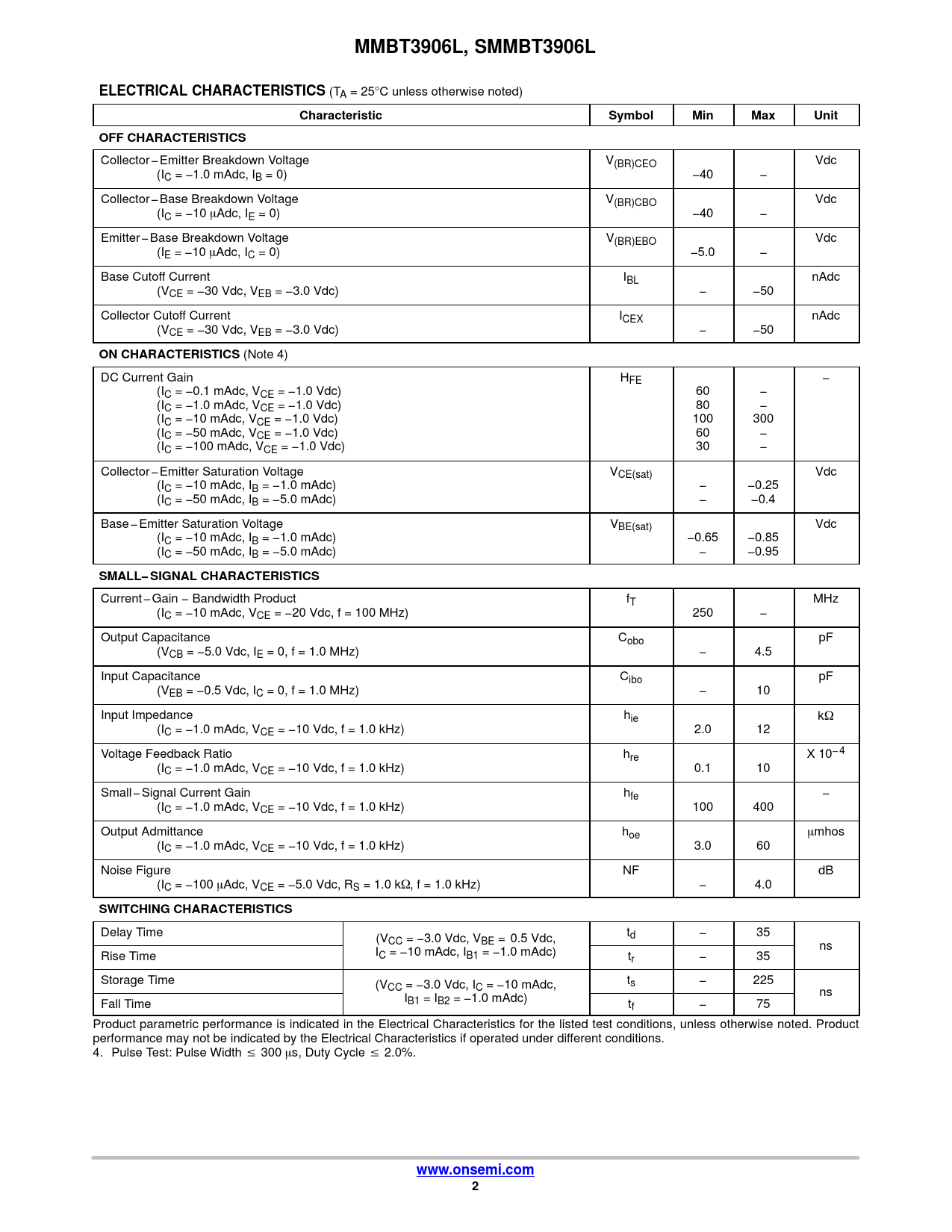 MMBT3906L, SMMBT3906L. ELECTRICAL CHARACTERISTICS. Characteristic. Symbol. Min. Max. Unit. OFF CHARACTERISTICS. ON CHARACTERISTICS