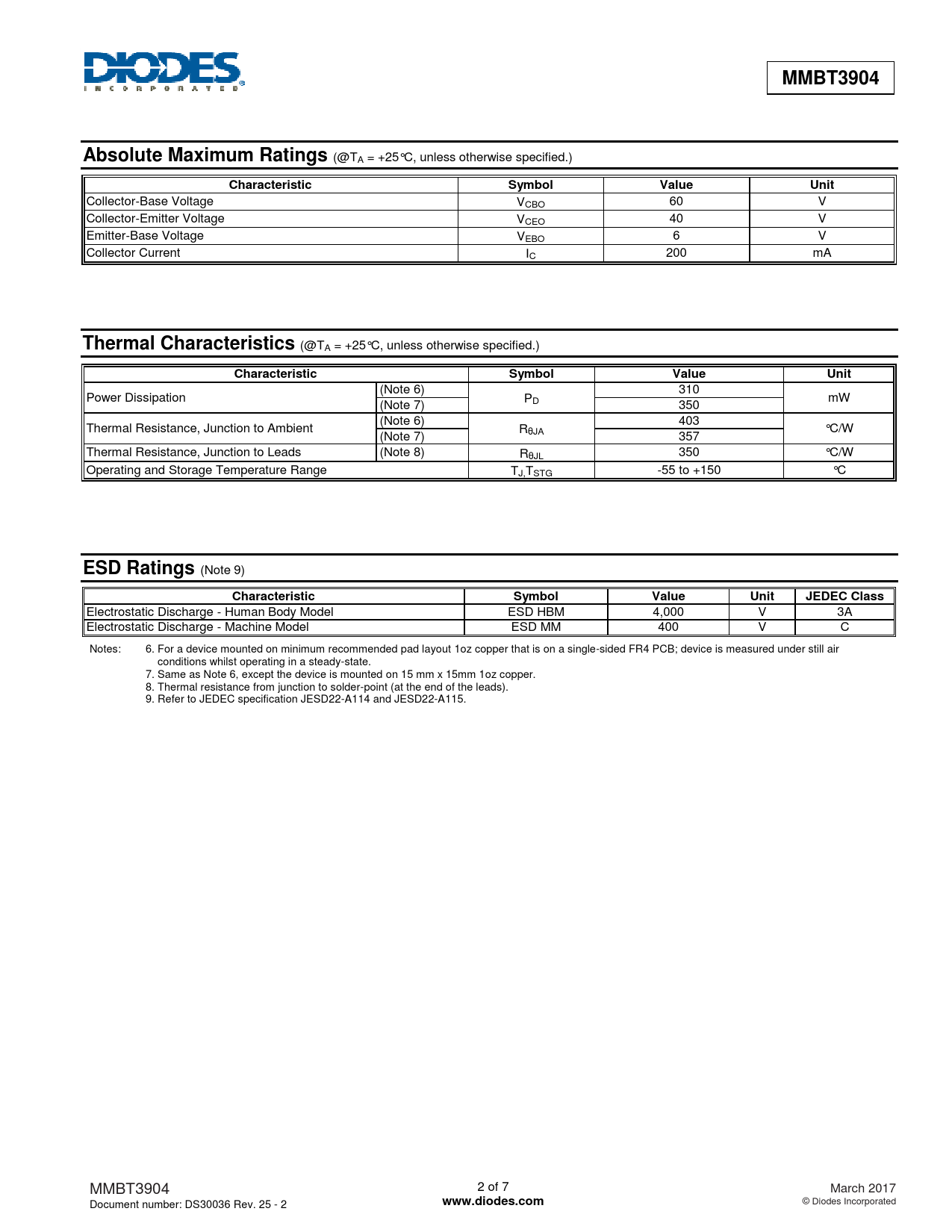 MMBT3904. Absolute Maximum Ratings. Characteristic. Symbol. Value. Unit. Thermal Characteristics. ESD Ratings. JEDEC Class