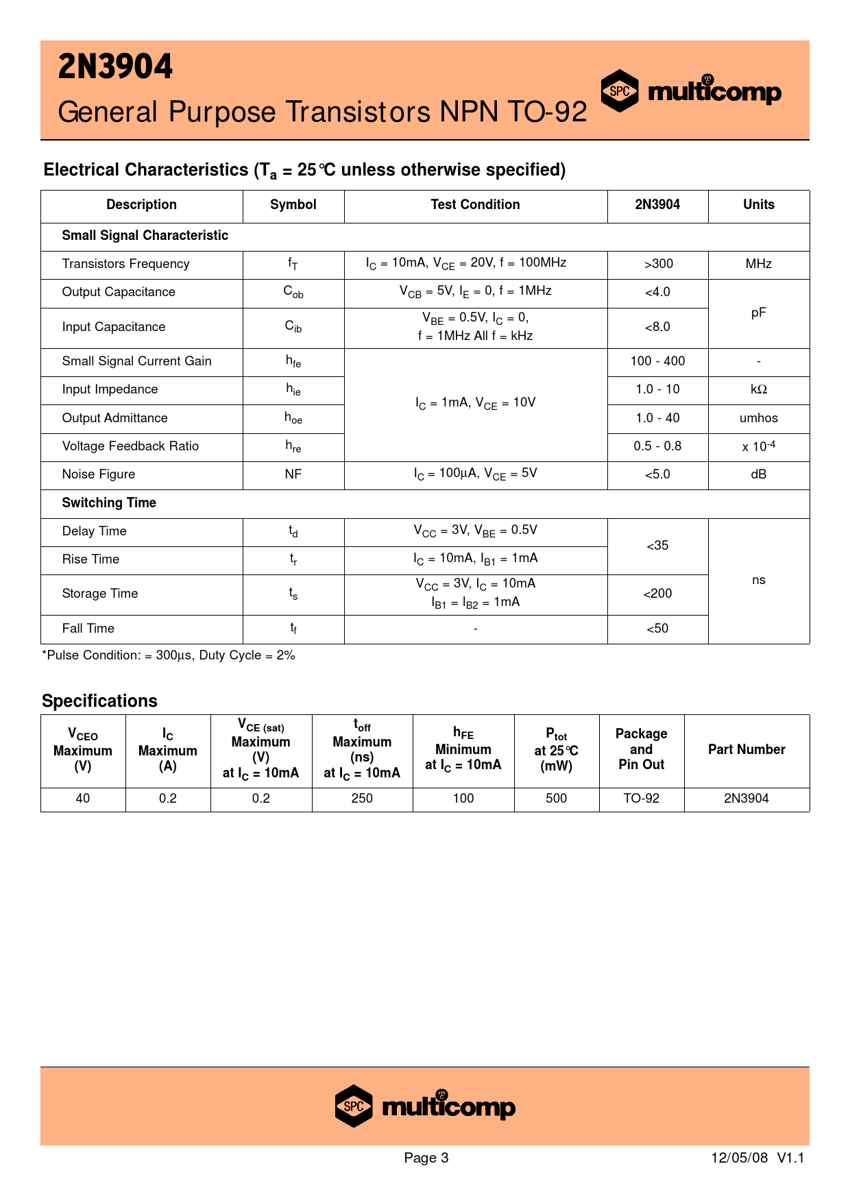 40 0.2 0.2 250 100 500 TO-92 2N3904 Page 3 12/05/08 V1.1