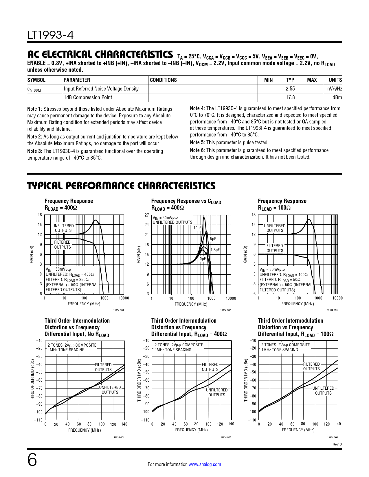 18 27 18 VIN = 50mVP-P 15 UNFILTERED 24 UNFILTERED OUTPUTS 15 UNFILTERED 10pF OUTPUTS OUTPUTS 12 21 12 5pF 9 FILTERED 18 9 FILTERED OUTPUTS 1.8pF OUTPUTS 6 15 6 0pF GAIN (dB) GAIN (dB) GAIN (dB) 3 12 3 VIN = 50mVP-P VIN = 50mVP-P 0 UNFILTERED: RLOAD = 400Ω 9 0 UNFILTERED: RLOAD = 100Ω FILTERED: RLOAD = 350Ω FILTERED: RLOAD = 50Ω –3 (EXTERNAL) + 50Ω (INTERNAL 6 –3 (EXTERNAL) + 50Ω (INTERNAL FILTERED OUTPUTS) FILTERED OUTPUTS) –6 3 –6 1 10 100 1000 10000 1 10 100 1000 10000 1 10 100 1000 10000 FREQUENCY (MHz) FREQUENCY (MHz) FREQUENCY (MHz) 19934 G01 19934 G02 19934 G03