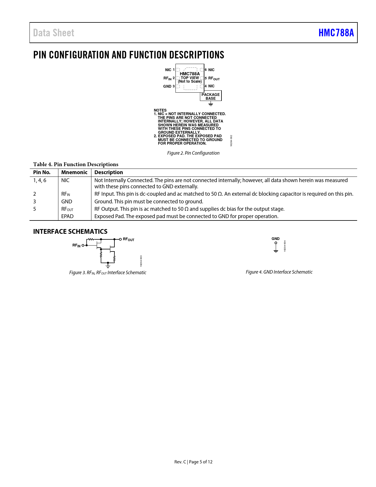 Data Sheet HMC788A PIN CONFIGURATION AND FUNCTION DESCRIPTIONS NIC 1 6 NIC TOP VIEW RFOUT (Not to Scale) GND 3 4 NIC PACKAGE BASE