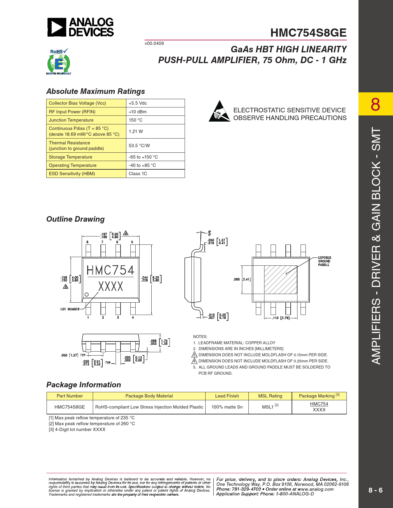 HMC754S8GE v00.0409 GaAs HBT HIGH LINEARITYPUSH-PULL AMPLIFIER, 75 Ohm, DC - 1 GHzAbsolute Maximum Ratings collector Bias voltage (vcc) +5.5 vdc rf input power (rfin) +10 dBm elecTrosTATic sensiTive Device 8 Junction Temperature 150 °c oBserve HAnDlinG precAUTions continuous pdiss (T = 85 °c) 1.21 W (derate 18.69 mW/°c above 85 °c) T Thermal resistance m 53.5 °c/W (junction to ground paddle) s storage Temperature -65 to +150 °c operating Temperature -40 to +85 °c k - esD sensitivity (HBm) class 1c c lo in B Outline Drawing A r & G e iv r s - D r ie noTes: lif 1. leADfrAme mATeriAl: copper AlloY 2. Dimensions Are in incHes [millimeTers] p 3. Dimension Does noT inclUDe molDflAsH of 0.15mm per siDe. m 4. Dimension Does noT inclUDe molDflAsH of 0.25mm per siDe. A 5. All GroUnD leADs AnD GroUnD pADDle mUsT Be solDereD To pcB rf GroUnD. Package Information part number package Body material lead finish msl rating package marking [3] Hmc754s8Ge roHs-compliant low stress injection molded plastic 100% matte sn msl1 [2] Hmc754 XXXX [1] max peak reflow temperature of 235 °c [2] max peak reflow temperature of 260 °c [3] 4-Digit lot number XXXX Inf F or o m rat ip o r n ifc ur e n ,is hd e e d lbiv y e Anry alo a g n D d evi cto es ips la beclie ev eo d rtd o e b r e sa: ccH ur iattte itaen M d reliic a r bl o e w . H a o v weev eC r, o n r o For price, delivery, and to place orders: Analog Devices, Inc., responsibility is assumed by Analog Devices for its use, nor for any infringements of patents or other poration, 20 Alpha Road, Chelmsford, MA 01824 One Technology Way, P.O. Box 9106, Norwood, MA 02062-9106 Phone: 978-250-3343 Fax: 978-250-3373 rights of third parties that may result from its use. Specifications subject to change without notice. No Or P d hoe n r e O : 7 n- 81-li 3 n 2 e 9- a 4 t 7 0 www 0 • O . rdh e itt r o it n e li . n co e a m license is granted by implication or otherwise under any patent or patent rights of Analog Devices. t www.analog.com 8 - 6 Application Support: Phon Trademarks and registered trademarks are the property of their respective owners. e: 978-250-334 A 3 p p liocra t ia o pp n S s u @ p h por ittti : Pte. ho c n o e m : 1-800-ANALOG-D