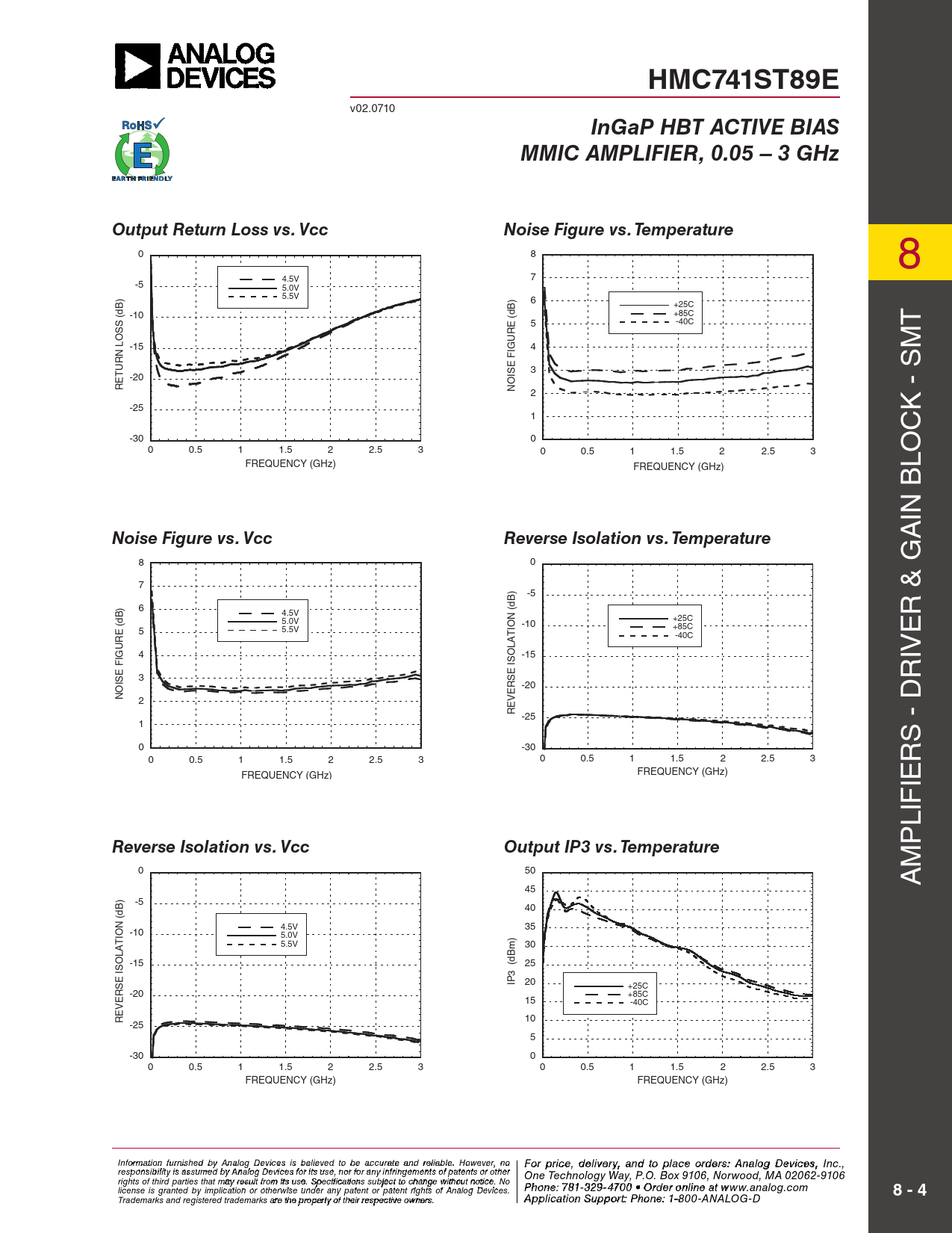 HMC741ST89E. InGaP HBT ACTIVE BIAS. MMIC AMPLIFIER, 0.05 – 3 GHz. Output Return Loss vs. Vcc. Noise Figure vs. Temperature