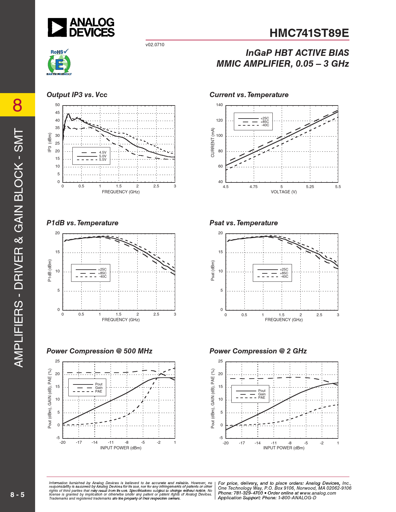 HMC741ST89E v02.0710 InGaP HBT ACTIVE BIASMMIC AMPLIFIER, 0.05 – 3 GHz 8 Output IP3 vs. VccCurrent vs. Temperature 50 140 45 40 120 +25C +85C T -40C 35 ) A ) m m 30 (m 100 T s 25 N E 3 (dB R IP 20 R 4.5V 80 U 5.0V C 15 5.5V k - 10 60 c 5 0 40 lo 0 0.5 1 1.5 2 2.5 3 4.5 4.75 5 5.25 5.5 FREQUENCY (GHz) VOLTAGE (V) in B A P1dB vs. TemperaturePsat vs. Temperature 20 20 r & G 15 15 e iv (dBm) +25C (dBm) +25C r 10 10 +85C +85C -40C -40C P1dB Psat 5 5 s - D r 0 0 0 0.5 1 1.5 2 2.5 3 0 0.5 1 1.5 2 2.5 3 ie FREQUENCY (GHz) FREQUENCY (GHz) lif p m Power Compression @ 500 MHzPower Compression @ 2 GHz A 25 25 ) 20 20 (% (% E E A A ), P 15 Pout Gain ), P 15 PAE Pout (dB (dB Gain IN IN 10 10 PAE A A ), G ), G m 5 m 5 out (dB 0 out (dB 0 P P -5 -5 -20 -17 -14 -11 -8 -5 -2 1 -20 -17 -14 -11 -8 -5 -2 1 INPUT POWER (dBm) INPUT POWER (dBm) Inf F or o m rat ip o r n ifc ur e n ,is hd e e d lbiv y e Anry alo a g n D d evi cto es ips la beclie ev eo d rtd o e b r e sa: ccH ur iattte itaen M d reliic a r bl o e w . H a o v weev eC r, o n r o For price, delivery, and to place orders: Analog Devices, Inc., responsibility is assumed by Analog Devices for its use, nor for any infringements of patents or other poration, 20 Alpha Road, Chelmsford, MA 01824 One Technology Way, P.O. Box 9106, Norwood, MA 02062-9106 Phone: 978-250-3343 Fax: 978-250-3373 rights of third parties that may result from its use. Specifications subject to change without notice. No Or P d hoe n r e O : 7 n- 81-li 3 n 2 e 9- a 4 t 7 0 www 0 • O . rdh e itt r o it n e li . n co e a m 8 - 5 license is granted by implication or otherwise under any patent or patent rights of Analog Devices. t www.analog.com Application Support: Phon Trademarks and registered trademarks are the property of their respective owners. e: 978-250-334 A 3 p p liocra t ia o pp n S s u @ p h por ittti : Pte. ho c n o e m : 1-800-ANALOG-D