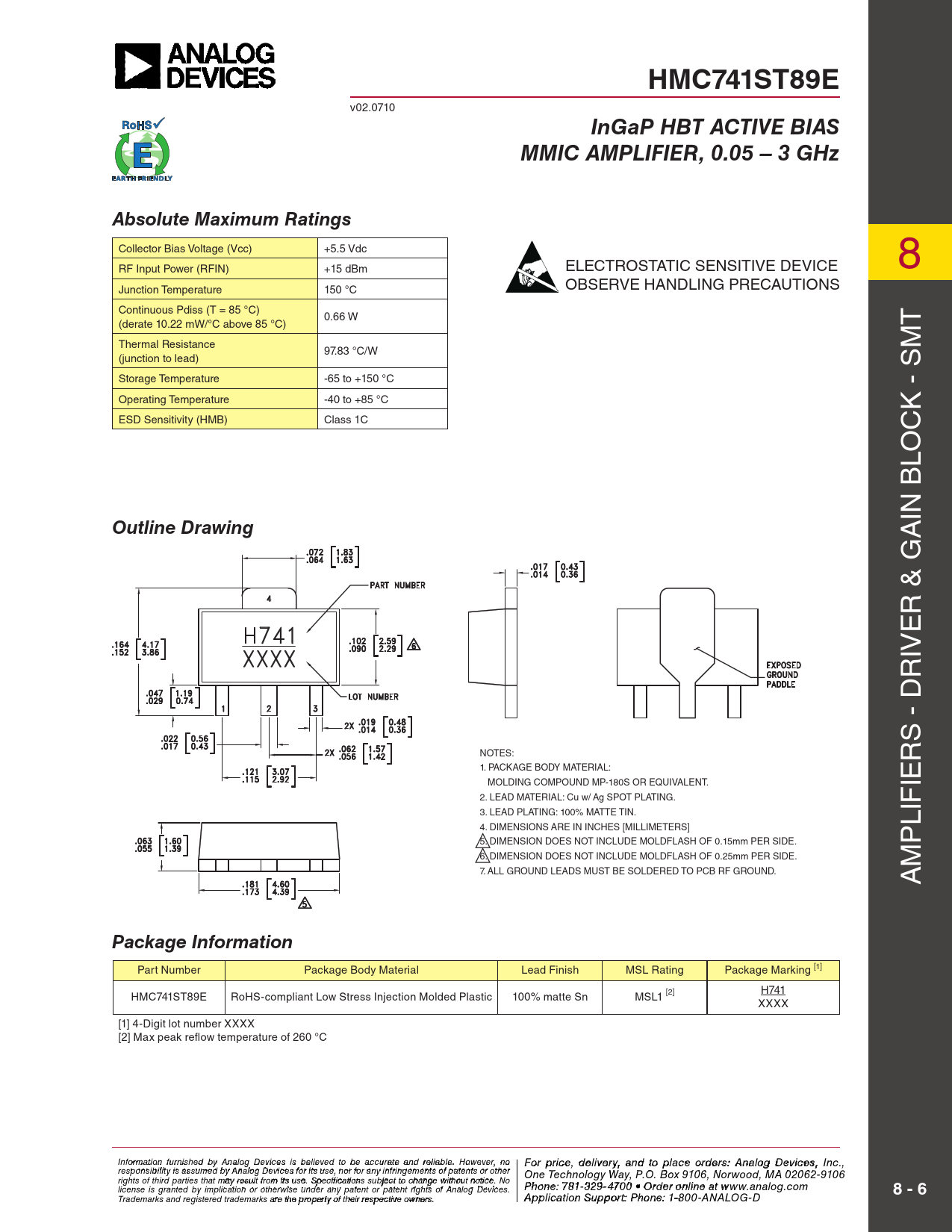 HMC741ST89E. InGaP HBT ACTIVE BIAS. MMIC AMPLIFIER, 0.05 – 3 GHz. Absolute Maximum Ratings. Outline Drawing. Package Information