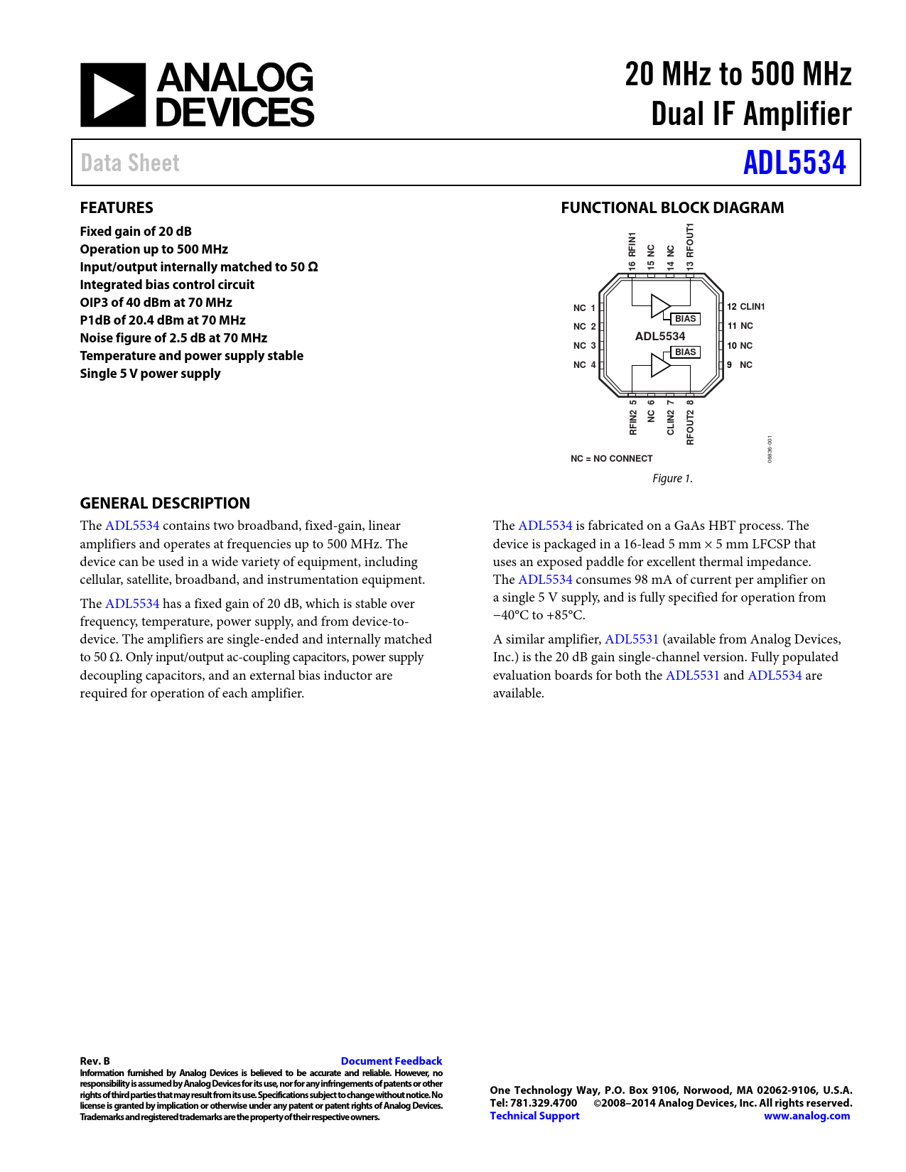 20 MHz to 500 MHz. Dual IF Amplifier. Data Sheet. ADL5534. FEATURES. FUNCTIONAL BLOCK DIAGRAM. Fixed gain of 20 dB