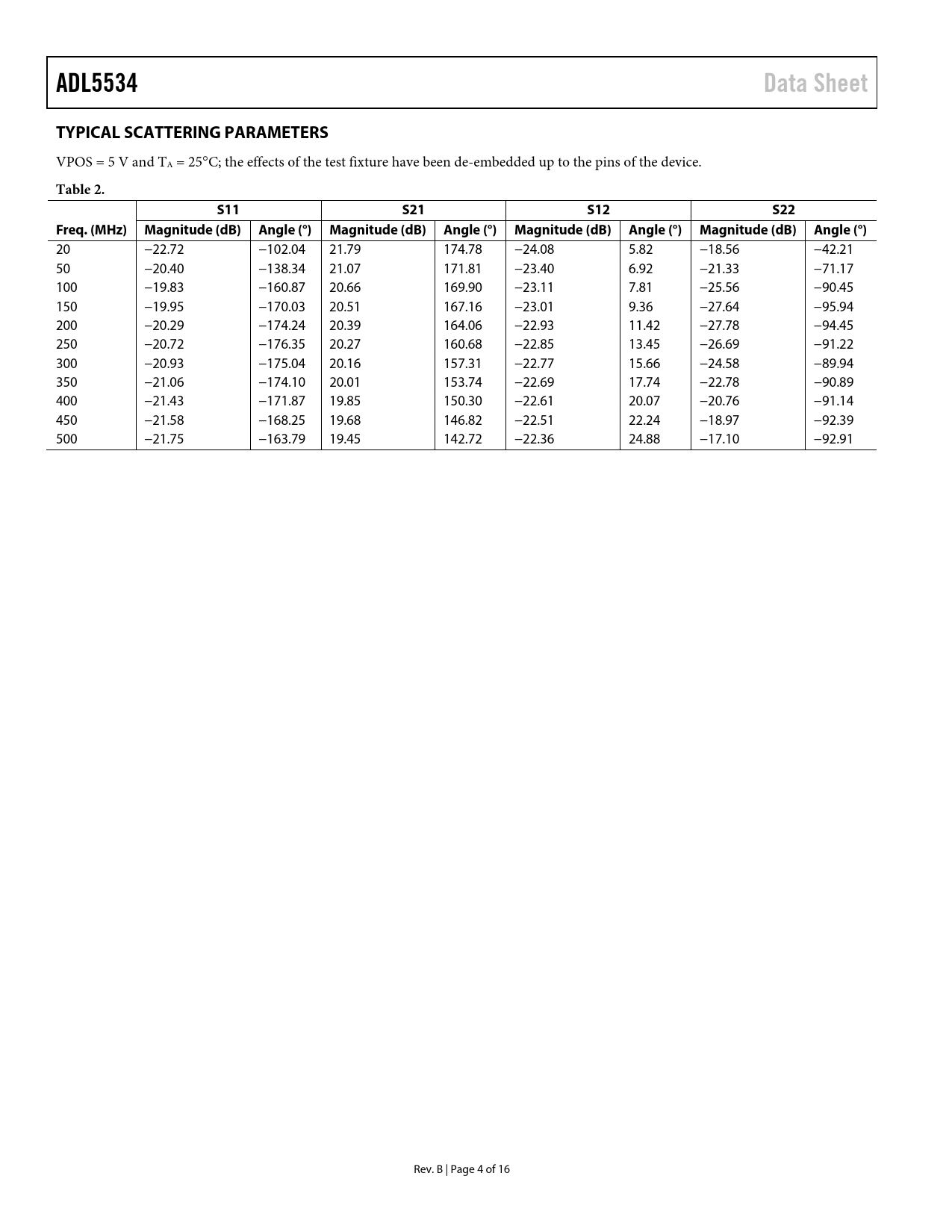 | Seiten / Seite | 16 / 4 — ADL5534. Data Sheet. TYPICAL SCATTERING PARAMETERS. Table 2. S11. S21. … |