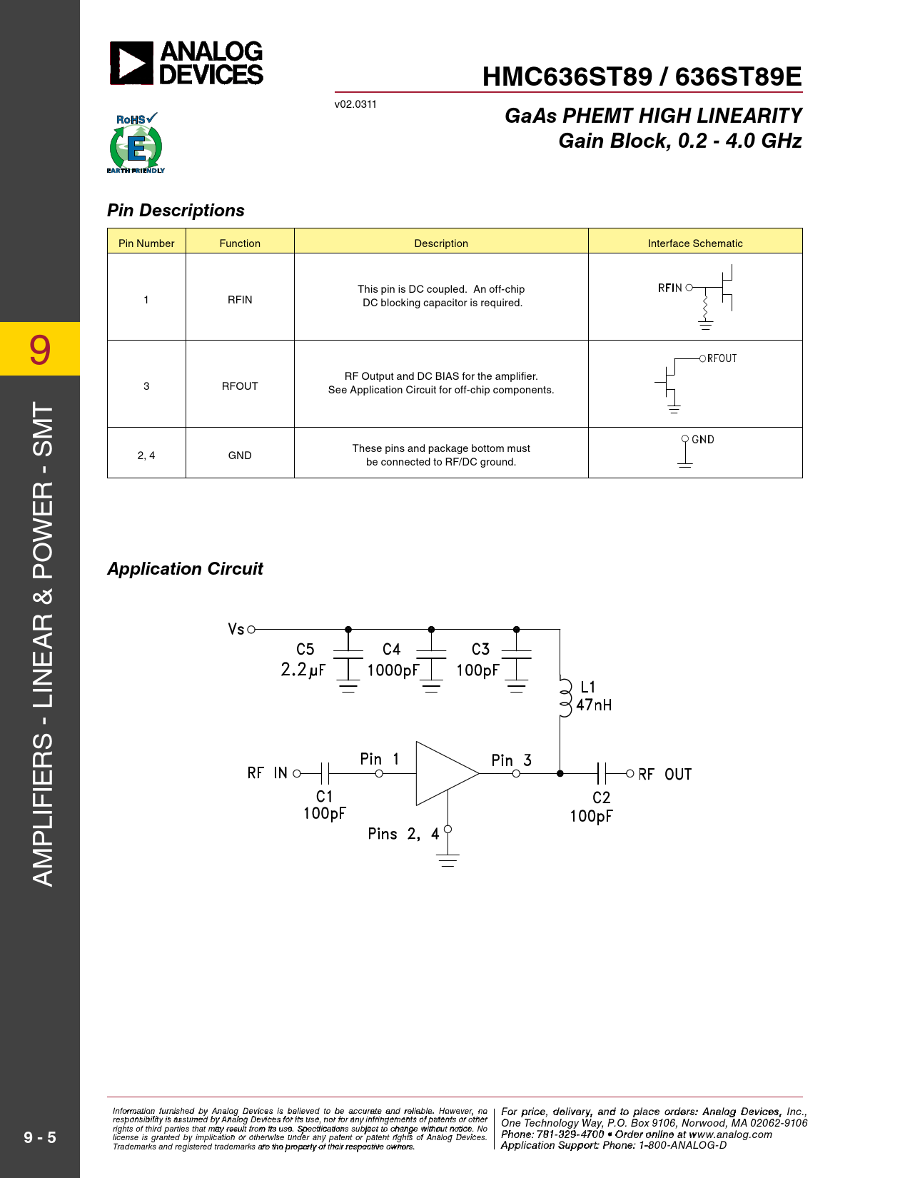 HMC636ST89 / 636ST89E v02.0311 GaAs pHEMT HiGH LinEAriTyGain Block, 0.2 - 4.0 GHzpin Descriptions pin number function Description interface schematic This pin is DC coupled. An off-chip 1 rfin DC blocking capacitor is required. 9 rf output and DC BiAs for the amplifier. 3 rfoUT see Application Circuit for off-chip components. T m s These pins and package bottom must 2, 4 GnD be connected to rf/DC ground. r - e w o p Application Circuit r & A e lin s - r ie lif p m A Inf F or o m rat ip o r n ifc ur e n ,is hd e e d lbiv y e Anry alo a g n D d evi cto es ips la beclie ev eo d rtd o e b r e sa: ccH ur iattte itaen M d reliic a r bl o e w . H a o v weev eC r, o n r o For price, delivery, and to place orders: Analog Devices, Inc., responsibility is assumed by Analog Devices for its use, nor for any infringements of patents or other poration, 20 Alpha Road, Chelmsford, MA 01824 One Technology Way, P.O. Box 9106, Norwood, MA 02062-9106 Phone: 978-250-3343 Fax: 978-250-3373 rights of third parties that may result from its use. Specifications subject to change without notice. No Or P d hoe n r e O : 7 n- 81-li 3 n 2 e 9- a 4 t 7 0 www 0 • O . rdh e itt r o it n e li . n co e a m 9 - 5 license is granted by implication or otherwise under any patent or patent rights of Analog Devices. t www.analog.com Application Support: Phon Trademarks and registered trademarks are the property of their respective owners. e: 978-250-334 A 3 p p liocra t ia o pp n S s u @ p h por ittti : Pte. ho c n o e m : 1-800-ANALOG-D