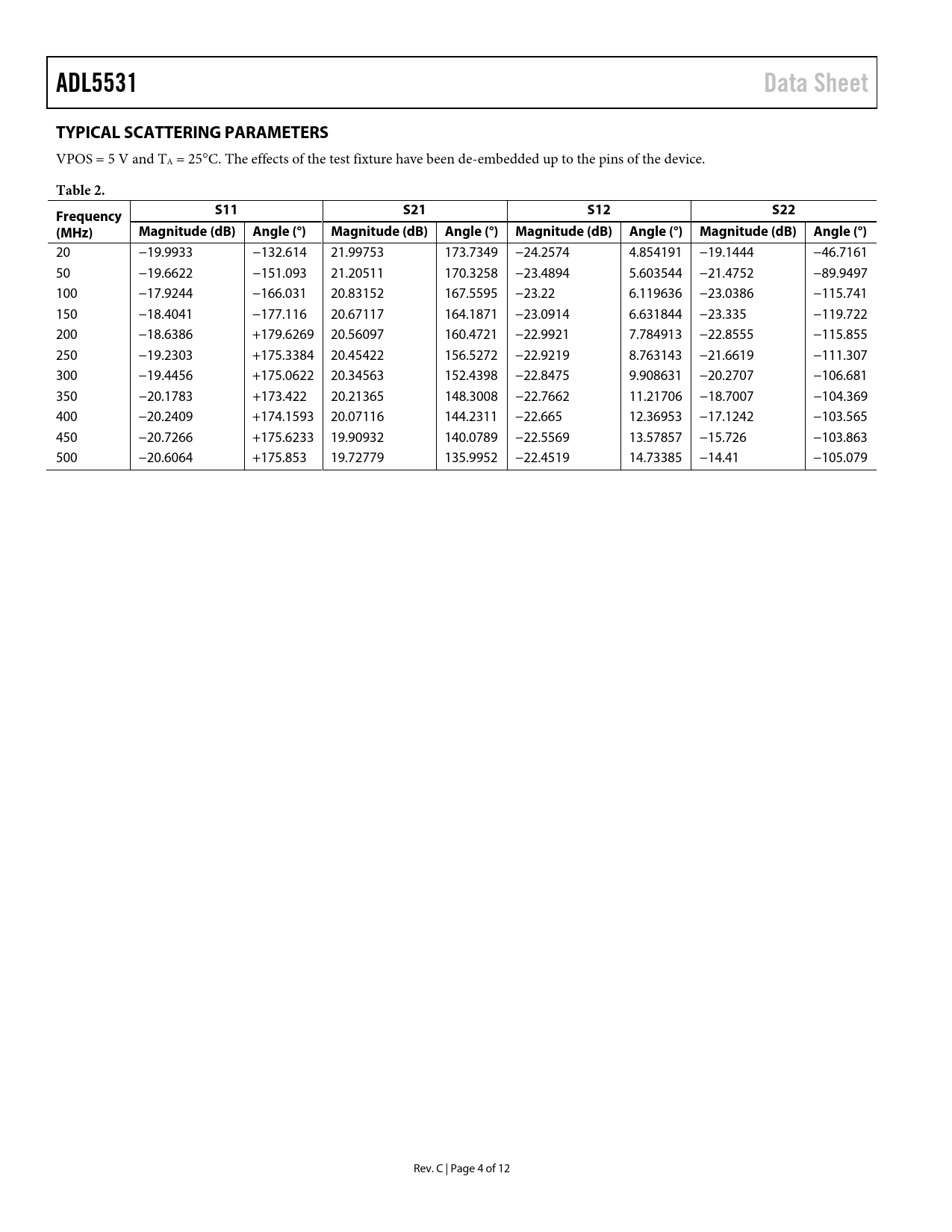 | Seiten / Seite | 12 / 4 — ADL5531. Data Sheet. TYPICAL SCATTERING PARAMETERS. Table 2. Frequency. … |