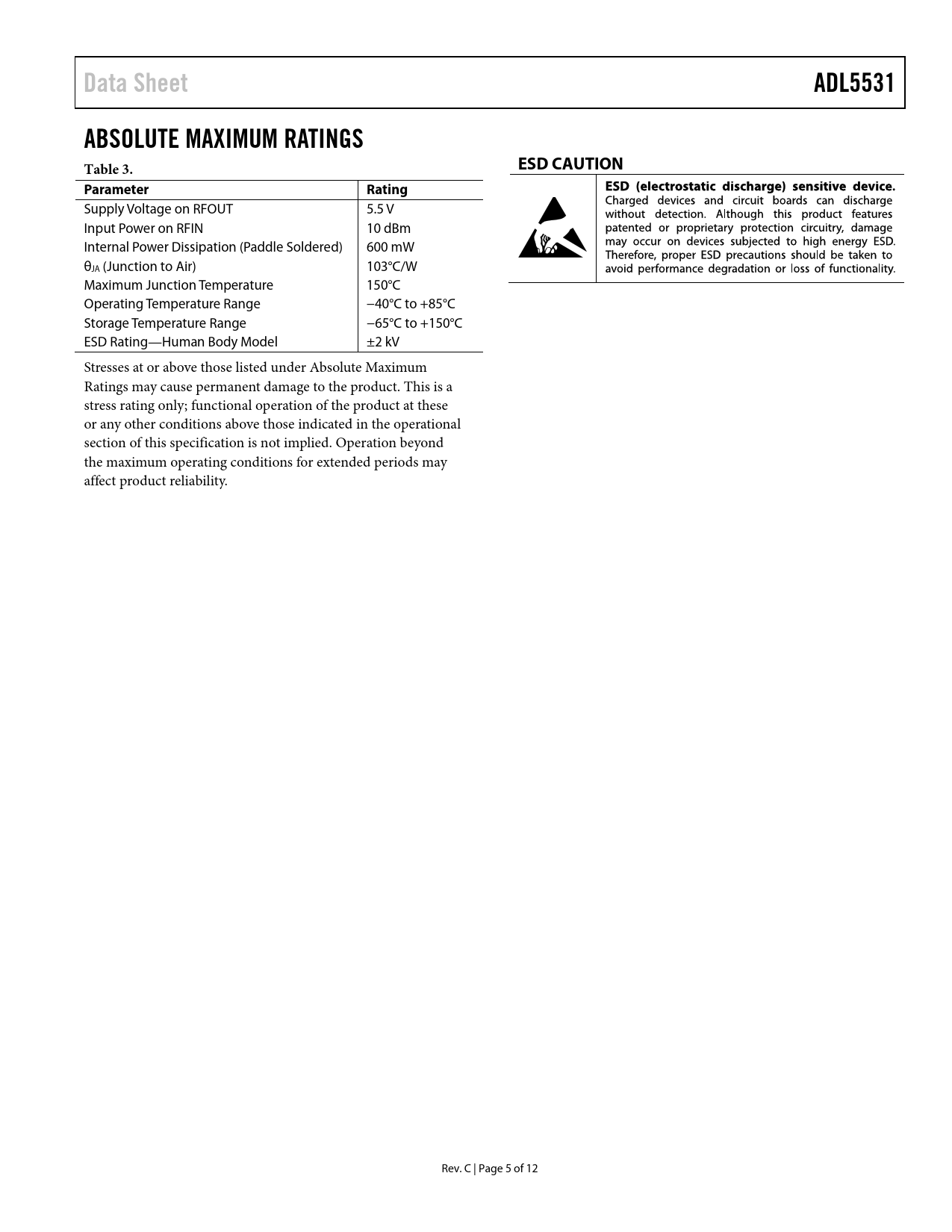 Data SheetADL5531ABSOLUTE MAXIMUM RATINGS Table 3.ESD CAUTIONParameterRating Supply Voltage on RFOUT 5.5 V Input Power on RFIN 10 dBm Internal Power Dissipation (Paddle Soldered) 600 mW θJA (Junction to Air) 103°C/W Maximum Junction Temperature 150°C Operating Temperature Range −40°C to +85°C Storage Temperature Range −65°C to +150°C ESD Rating—Human Body Model ±2 kV Stresses at or above those listed under Absolute Maximum Ratings may cause permanent damage to the product. This is a stress rating only; functional operation of the product at these or any other conditions above those indicated in the operational section of this specification is not implied. Operation beyond the maximum operating conditions for extended periods may affect product reliability. Rev. C | Page 5 of 12 Document Outline FEATURES FUNCTIONAL BLOCK DIAGRAM GENERAL DESCRIPTION REVISION HISTORY SPECIFICATIONS TYPICAL SCATTERING PARAMETERS ABSOLUTE MAXIMUM RATINGS ESD CAUTION PIN CONFIGURATION AND FUNCTION DESCRIPTIONS TYPICAL PERFORMANCE CHARACTERISTICS BASIC CONNECTIONS SOLDERING INFORMATION AND RECOMMENDED PCB LAND PATTERN EVALUATION BOARD OUTLINE DIMENSIONS ORDERING GUIDE