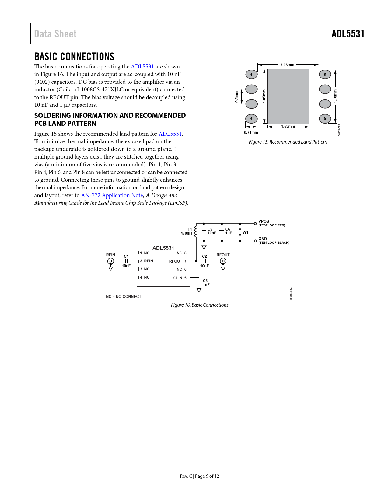 link to page 9 link to page 9 Data SheetADL5531BASIC CONNECTIONS The basic connections for operating the ADL5531 are shown 2.03mm in Figure 16. The input and output are ac-coupled with 10 nF 18 (0402) capacitors. DC bias is provided to the amplifier via an inductor (Coilcraft 1008CS-471XJLC or equivalent) connected to the RFOUT pin. The bias voltage should be decoupled using 5mm85mm78mm 10 nF and 1 μF capacitors. 0.1.1.SOLDERING INFORMATION AND RECOMMENDED45PCB LAND PATTERN1.53mm 015 Figure 15 shows the recommended land pattern for ADL5531. 0.71mm 06833- To minimize thermal impedance, the exposed pad on the Figure 15. Recommended Land Pattern package underside is soldered down to a ground plane. If multiple ground layers exist, they are stitched together using vias (a minimum of five vias is recommended). Pin 1, Pin 3, Pin 4, Pin 6, and Pin 8 can be left unconnected or can be connected to ground. Connecting these pins to ground slightly enhances thermal impedance. For more information on land pattern design and layout, refer to AN-772 Application Note, A Design and Manufacturing Guide for the Lead Frame Chip Scale Package (LFCSP). VPOS(TESTLOOP RED)L1C5C6470nH10nF1µFW1GND(TESTLOOP BLACK)ADL55311 NCNC 8RFINRFOUTC1C22 RFINRFOUT 710nF10nF3 NCNC 64 NCCLIN 5C31nF 014 NC = NO CONNECT 06833- Figure 16. Basic Connections Rev. C | Page 9 of 12 Document Outline FEATURES FUNCTIONAL BLOCK DIAGRAM GENERAL DESCRIPTION REVISION HISTORY SPECIFICATIONS TYPICAL SCATTERING PARAMETERS ABSOLUTE MAXIMUM RATINGS ESD CAUTION PIN CONFIGURATION AND FUNCTION DESCRIPTIONS TYPICAL PERFORMANCE CHARACTERISTICS BASIC CONNECTIONS SOLDERING INFORMATION AND RECOMMENDED PCB LAND PATTERN EVALUATION BOARD OUTLINE DIMENSIONS ORDERING GUIDE