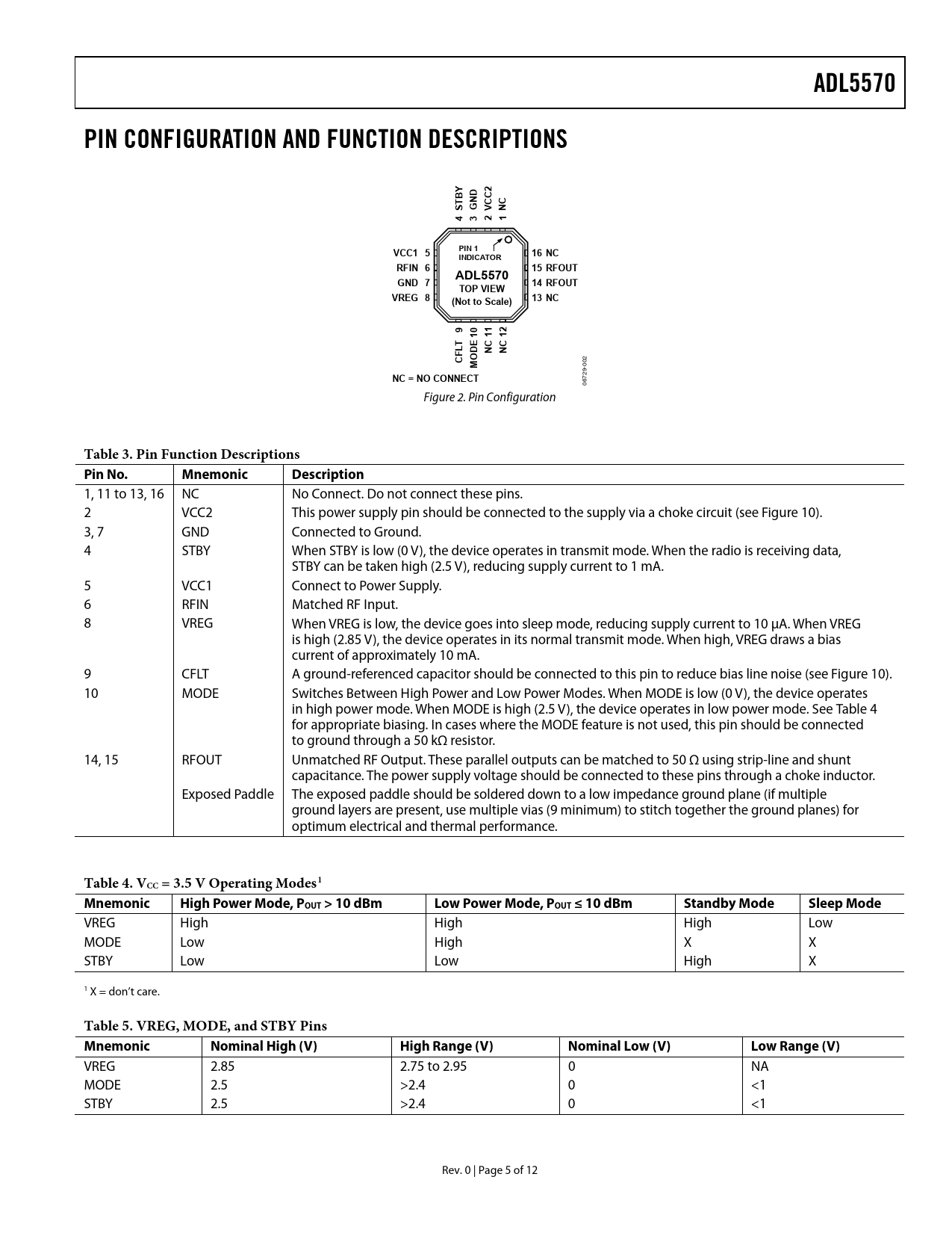 link to page 8 link to page 8 link to page 5 link to page 5 ADL5570PIN CONFIGURATION AND FUNCTION DESCRIPTIONSYD2BNCTCCSGVN4321PIN 1VCC1 516 NCINDICATORRFIN 615 RFOUTADL5570GND 714 RFOUTTOP VIEWVREG 813 NC(Not to Scale)9012111TL E C CFDNNO 2 CM -00 29 NC = NO CONNECT 067 Figure 2. Pin Configuration Table 3. Pin Function Descriptions Pin No.MnemonicDescription 1, 11 to 13, 16 NC No Connect. Do not connect these pins. 2 VCC2 This power supply pin should be connected to the supply via a choke circuit (see Figure 10). 3, 7 GND Connected to Ground. 4 STBY When STBY is low (0 V), the device operates in transmit mode. When the radio is receiving data, STBY can be taken high (2.5 V), reducing supply current to 1 mA. 5 VCC1 Connect to Power Supply. 6 RFIN Matched RF Input. 8 VREG When VREG is low, the device goes into sleep mode, reducing supply current to 10 μA. When VREG is high (2.85 V), the device operates in its normal transmit mode. When high, VREG draws a bias current of approximately 10 mA. 9 CFLT A ground-referenced capacitor should be connected to this pin to reduce bias line noise (see Figure 10). 10 MODE Switches Between High Power and Low Power Modes. When MODE is low (0 V), the device operates in high power mode. When MODE is high (2.5 V), the device operates in low power mode. See Table 4 for appropriate biasing. In cases where the MODE feature is not used, this pin should be connected to ground through a 50 kΩ resistor. 14, 15 RFOUT Unmatched RF Output. These parallel outputs can be matched to 50 Ω using strip-line and shunt capacitance. The power supply voltage should be connected to these pins through a choke inductor. Exposed Paddle The exposed paddle should be soldered down to a low impedance ground plane (if multiple ground layers are present, use multiple vias (9 minimum) to stitch together the ground planes) for optimum electrical and thermal performance. Table 4. VCC = 3.5 V Operating Modes1MnemonicHigh Power Mode, POUT > 10 dBmLow Power Mode, POUT ≤ 10 dBmStandby ModeSleep Mode VREG High High High Low MODE Low High X X STBY Low Low High X 1 X = don’t care. Table 5. VREG, MODE, and STBY Pins MnemonicNominal High (V)High Range (V)Nominal Low (V)Low Range (V) VREG 2.85 2.75 to 2.95 0 NA MODE 2.5 >2.4 0 <1 STBY 2.5 >2.4 0 <1 Rev. 0 | Page 5 of 12 Document Outline FEATURES APPLICATIONS FUNCTIONAL BLOCK DIAGRAM GENERAL DESCRIPTION TABLE OF CONTENTS REVISION HISTORY SPECIFICATIONS VCC = 3.5 V ABSOLUTE MAXIMUM RATINGS ESD CAUTION PIN CONFIGURATION AND FUNCTION DESCRIPTIONS TYPICAL PERFORMANCE CHARACTERISTICS APPLICATIONS BASIC CONNECTIONS Power Supply RF Input Interface RF Output Interface Transmit/Standby Enable VREG Enable MODE High Power/Low Power Enable 64 QAM OFDMA PERFORMANCE POWER-ADDED EFFICIENCY EVALUATION BOARD MEASUREMENT SETUP USING THE ADL5570 EVALUATION BOARD OUTLINE DIMENSIONS ORDERING GUIDE