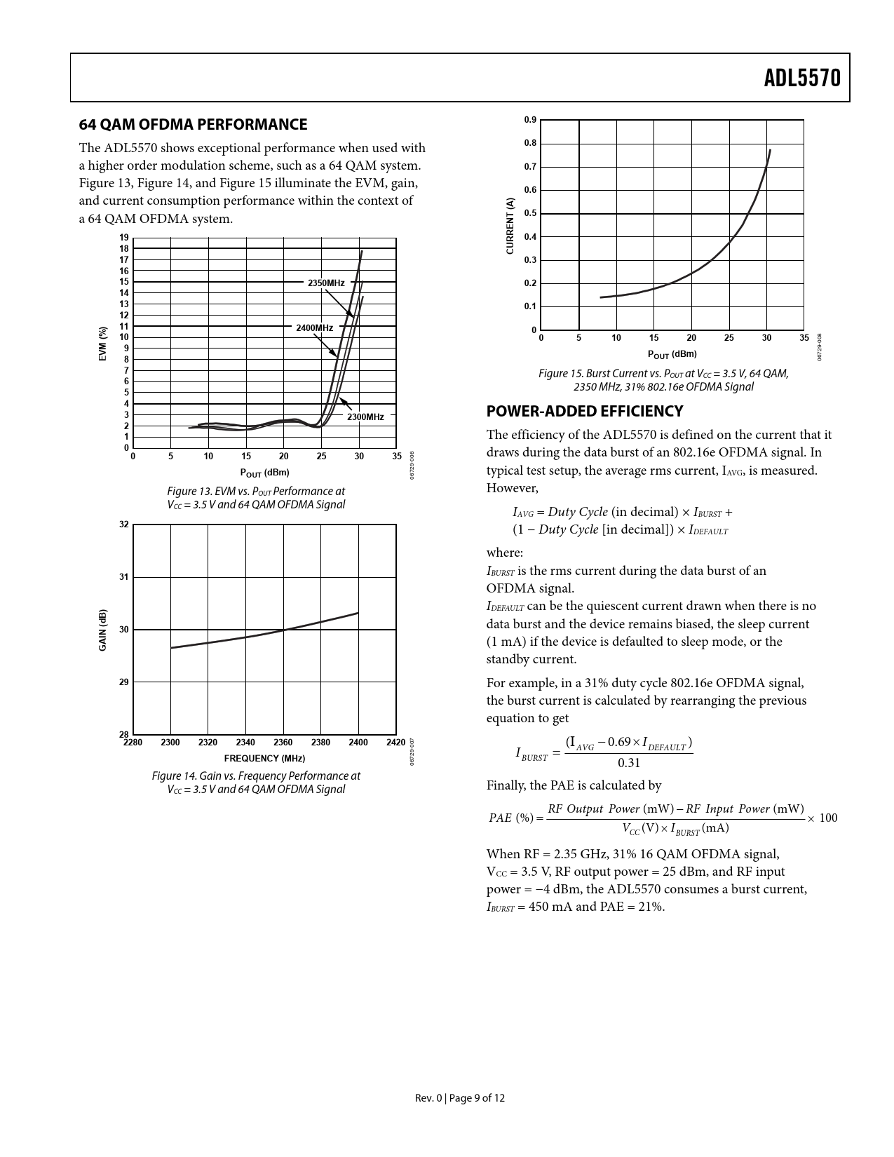 link to page 9 link to page 9 link to page 9 ADL557064 QAM OFDMA PERFORMANCE0.9 The ADL5570 shows exceptional performance when used with 0.8 a higher order modulation scheme, such as a 64 QAM system. 0.7 Figure 13, Figure 14, and Figure 15 illuminate the EVM, gain, 0.6 and current consumption performance within the context of ) A ( a 64 QAM OFDMA system. 0.5NT E190.418CURR170.316 152350MHz0.214 130.112)112400MHz01005101520253035 08 0 M (%9 9- 72 EVP8OUT (dBm) 06 7 Figure 15. Burst Current vs. POUT at VCC = 3.5 V, 64 QAM, 6 2350 MHz, 31% 802.16e OFDMA Signal 5 4 32300MHzPOWER-ADDED EFFICIENCY2 1 The efficiency of the ADL5570 is defined on the current that it 0 draws during the data burst of an 802.16e OFDMA signal. In 06 05101520253035 0 9- 72 POUT (dBm) typical test setup, the average rms current, IAVG, is measured. 06 Figure 13. EVM vs. P However, OUT Performance at VCC = 3.5 V and 64 QAM OFDMA Signal IAVG = Duty Cycle (in decimal) × IBURST + 32 (1 − Duty Cycle [in decimal]) × IDEFAULT where: I 31 BURST is the rms current during the data burst of an OFDMA signal. ) IDEFAULT can be the quiescent current drawn when there is no B d (30 data burst and the device remains biased, the sleep current IN (1 mA) if the device is defaulted to sleep mode, or the GA standby current. 29 For example, in a 31% duty cycle 802.16e OFDMA signal, the burst current is calculated by rearranging the previous equation to get 2822802300232023402360238024002420 7 (Ι − 0.69× I ) -00 AVG DEFAULT = 29 I FREQUENCY (MHz) 67 BURST 0 0.31 Figure 14. Gain vs. Frequency Performance at V Finally, the PAE is calculated by CC = 3.5 V and 64 QAM OFDMA Signal RF Output Power (mW) − RF Input Power (mW) PAE (%) = × 100 V (V) × I (mA) CC BURST When RF = 2.35 GHz, 31% 16 QAM OFDMA signal, VCC = 3.5 V, RF output power = 25 dBm, and RF input power = −4 dBm, the ADL5570 consumes a burst current, IBURST = 450 mA and PAE = 21%. Rev. 0 | Page 9 of 12 Document Outline FEATURES APPLICATIONS FUNCTIONAL BLOCK DIAGRAM GENERAL DESCRIPTION TABLE OF CONTENTS REVISION HISTORY SPECIFICATIONS VCC = 3.5 V ABSOLUTE MAXIMUM RATINGS ESD CAUTION PIN CONFIGURATION AND FUNCTION DESCRIPTIONS TYPICAL PERFORMANCE CHARACTERISTICS APPLICATIONS BASIC CONNECTIONS Power Supply RF Input Interface RF Output Interface Transmit/Standby Enable VREG Enable MODE High Power/Low Power Enable 64 QAM OFDMA PERFORMANCE POWER-ADDED EFFICIENCY EVALUATION BOARD MEASUREMENT SETUP USING THE ADL5570 EVALUATION BOARD OUTLINE DIMENSIONS ORDERING GUIDE