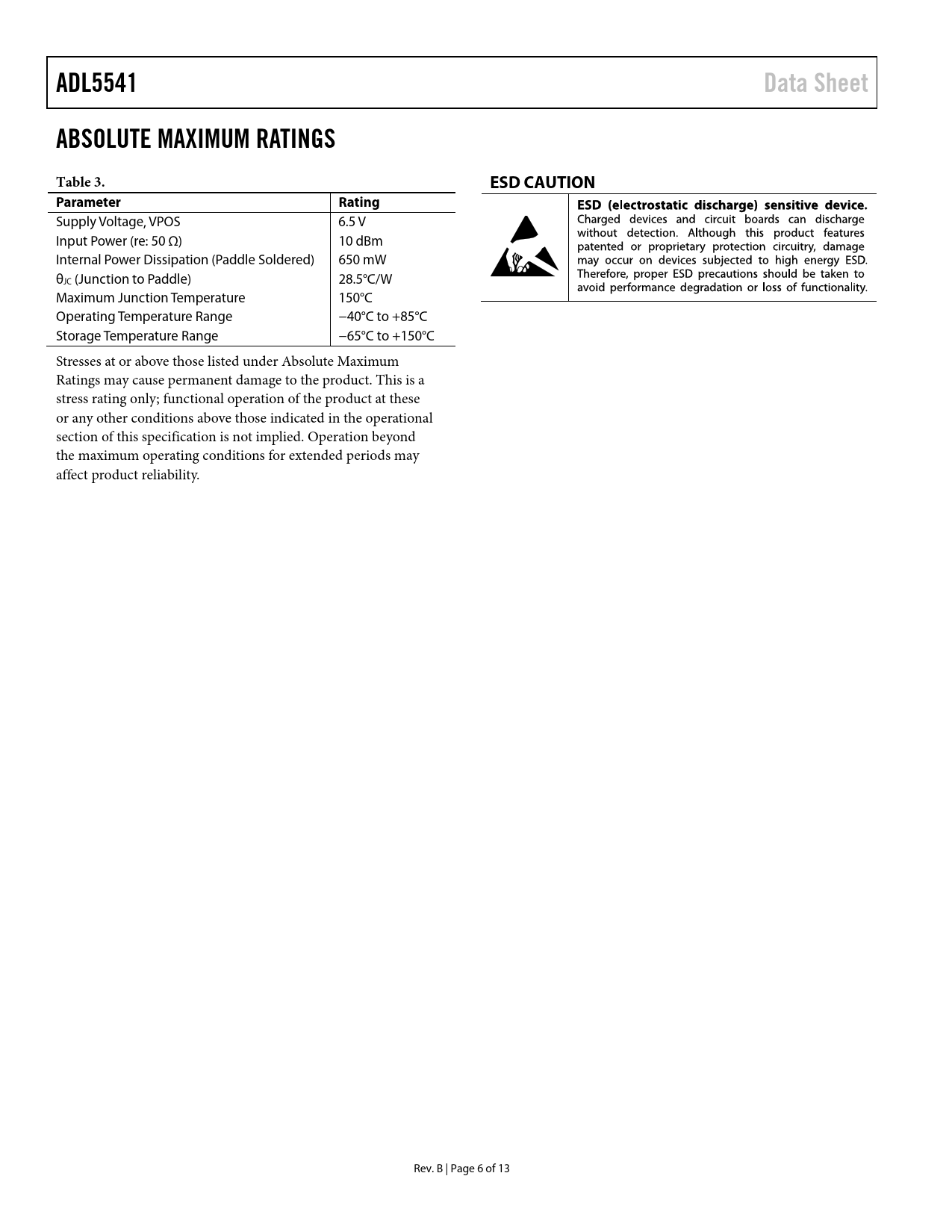 Seiten / Seite13 / 6 — ADL5541. Data Sheet. ABSOLUTE MAXIMUM RATINGS. Table 3. ESD CAUTION. …