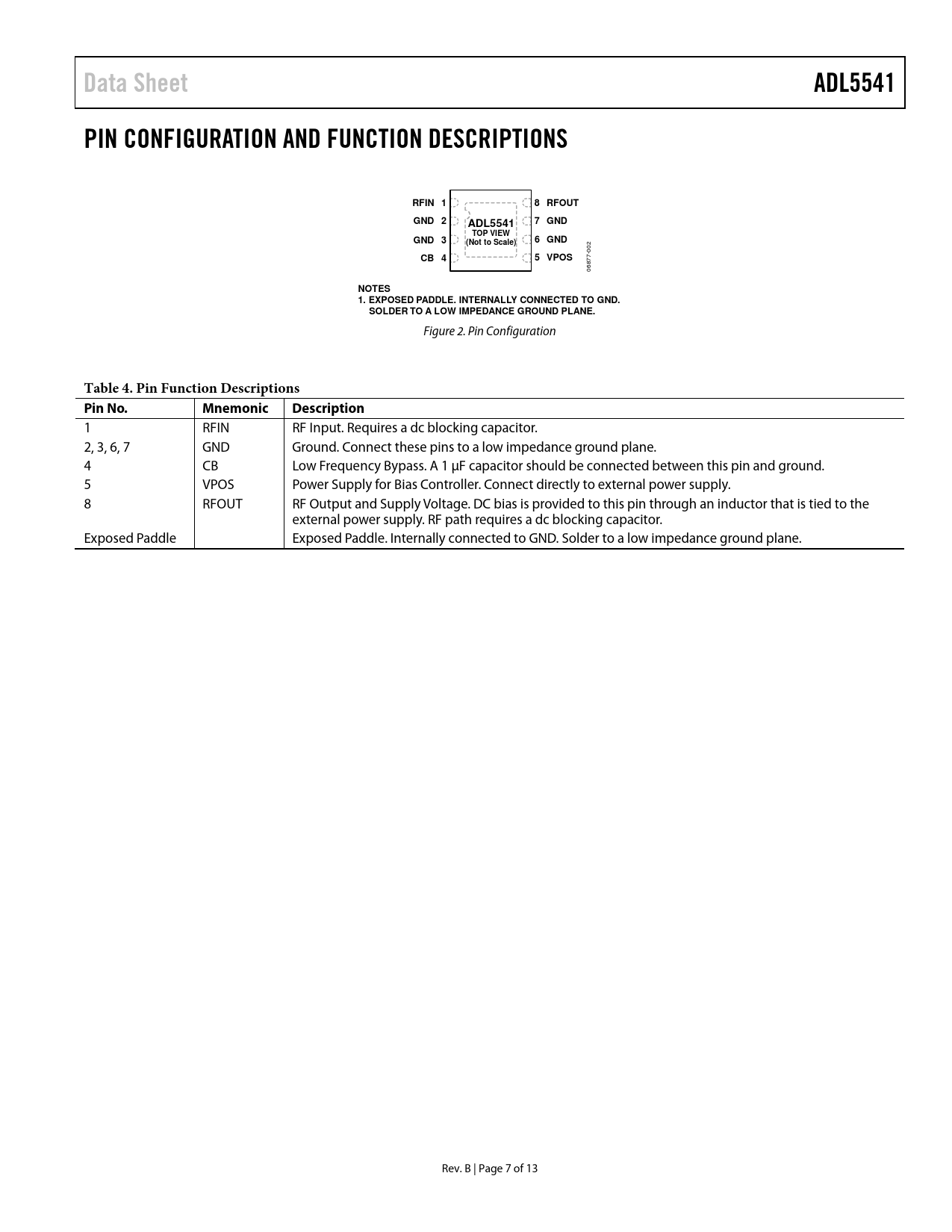 Data Sheet. ADL5541. PIN CONFIGURATION AND FUNCTION DESCRIPTIONS. RFIN 1. 8 RFOUT. GND 2. 7 GND. TOP VIEW. GND 3. 6 GND. (Not to Scale). CB 4