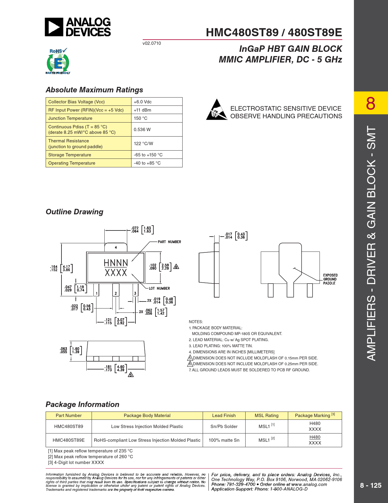 HMC480ST89 / 480ST89E. InGaP HBT GAIN BLOCK. MMIC AMPLIFIER, DC - 5 GHz. Absolute Maximum Ratings. Outline Drawing