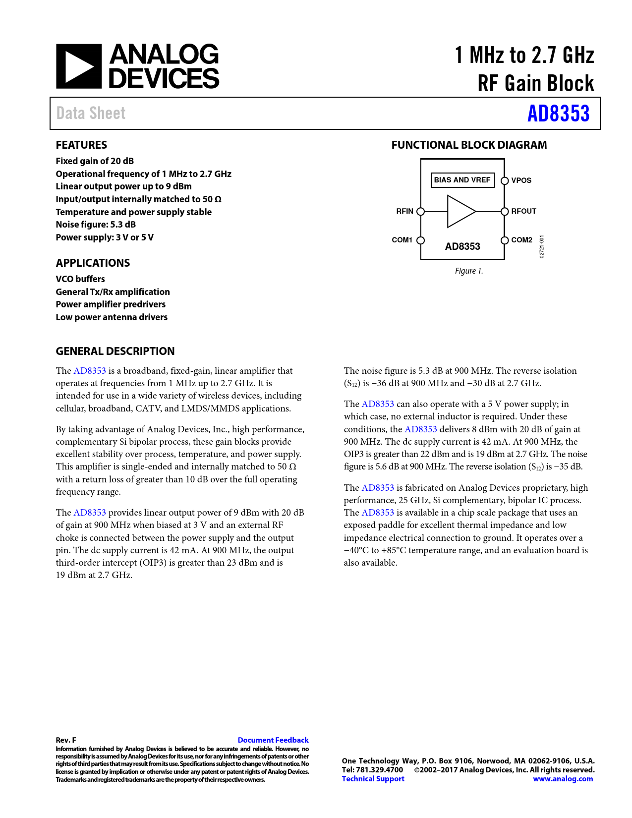 1 MHz to 2.7 GHz. RF Gain Block. Data Sheet. AD8353. FEATURES. FUNCTIONAL BLOCK DIAGRAM