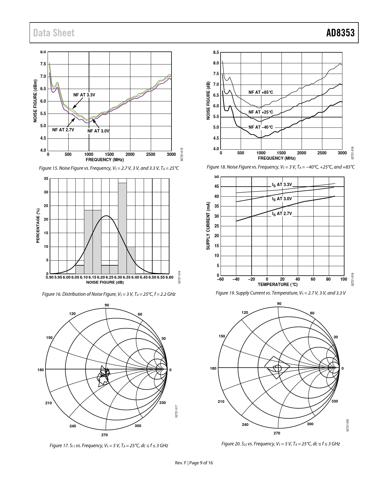 Data SheetAD83538.08.57.58.07.57.0) m7.0dB 6.5( ENF AT +85°CRNF AT 3.3V6.56.06.0FIGU E 5.5 � NF AT +25°COISNOISE FIGURE (dB) 5.5N5.05.0NF AT –40°CNF AT 2.7V Ð � NF AT 3.0V4.54.54.04.0 015 050010001500200025003000050010001500200025003000FREQUENCY (MHz)FREQUENCY (MHz) 02721-018 02721- Figure 15. Noise Figure vs. Frequency, V Figure 18. Noise Figure vs. Frequency, V S = 2.7 V, 3 V, and 3.3 V, TA = 25°C S = 3 V, TA = −40°C, +25°C, and +85°C 355045IS AT 3.3V3040IS AT 3.0V2535mA) (INT30S AT 2.7V202515CURRE Y L20PERCENTAGE (%)P10UP15S1055005.90 5.95 6.00 6.05 6.10 6.15 6.20 6.25 6.30 6.35 6.40 6.45 6.50 6.55 6.60 019 –60–40–20020406080100NOISE FIGURE (dB) 02721-016 TEMPERATURE (°C) 02721- Figure 16. Distribution of Noise Figure, V Figure 19. Supply Current vs. Temperature, V S = 3 V, TA = 25°C, f = 2.2 GHz S = 2.7 V, 3 V, and 3.3 V 90901201206060150150303018001800210330210330 02721-017 240300240300 02721-020 270270 Figure 17. S Figure 20. S 11 vs. Frequency, VS = 5 V, TA = 25°C, dc ≤ f ≤ 3 GHz 22 vs. Frequency, VS = 5 V, TA = 25°C, dc ≤ f ≤ 3 GHz Rev. F | Page 9 of 16 Document Outline FEATURES APPLICATIONS FUNCTIONAL BLOCK DIAGRAM GENERAL DESCRIPTION REVISION HISTORY SPECIFICATIONS ABSOLUTE MAXIMUM RATINGS ESD CAUTION PIN CONFIGURATION AND FUNCTION DESCRIPTIONS TYPICAL PERFORMANCE CHARACTERISTICS THEORY OF OPERATION BASIC CONNECTIONS APPLICATIONS INFORMATION LOW FREQUENCY APPLICATIONS BELOW 100 MHz EVALUATION BOARD OUTLINE DIMENSIONS ORDERING GUIDE