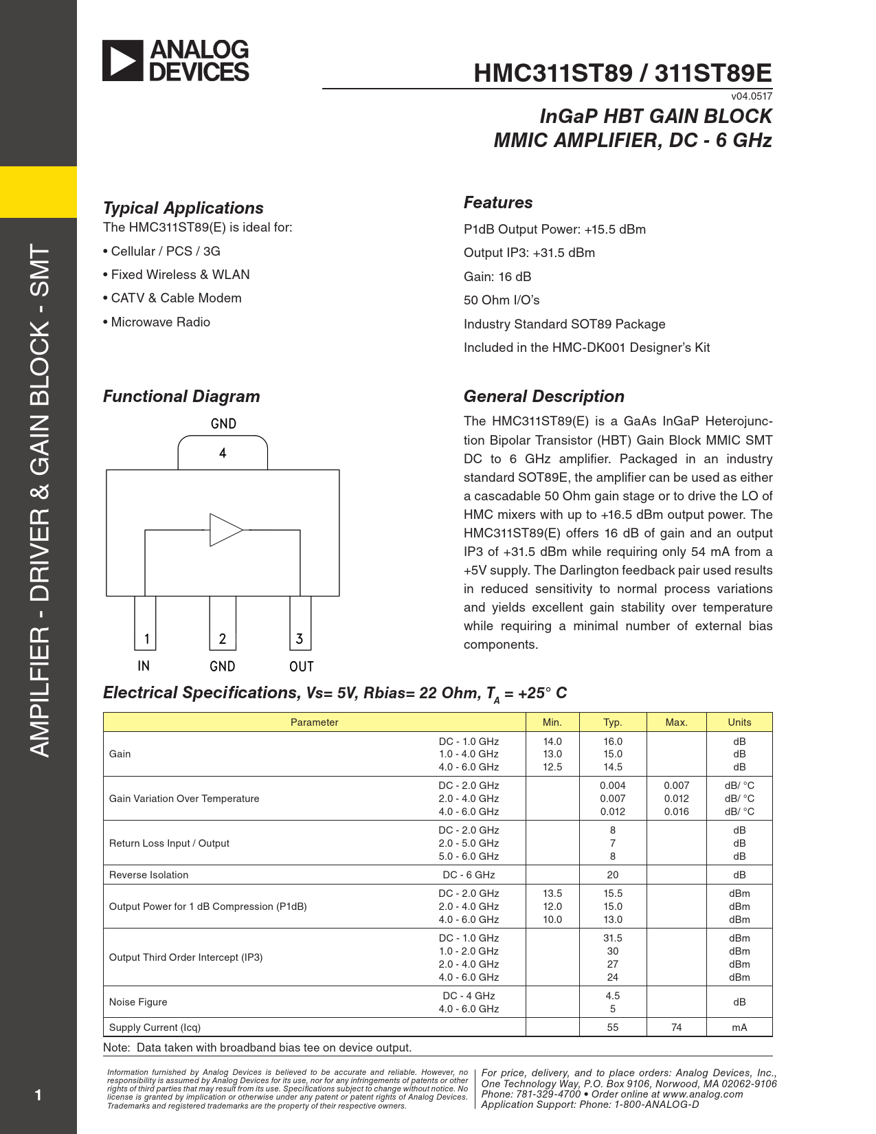 IN B The HMC311ST89(E) is a GaAs InGaP Heterojunc- A tion Bipolar Transistor (HBT) Gain Block MMIC SMT DC to 6 GHz amplifier. Packaged in an industry standard SOT89E, the amplifier can be used as either a cascadable 50 Ohm gain stage or to drive the LO of R & G HMC mixers with up to +16.5 dBm output power. The E HMC311ST89(E) offers 16 dB of gain and an output IV IP3 of +31.5 dBm while requiring only 54 mA from a R +5V supply. The Darlington feedback pair used results in reduced sensitivity to normal process variations and yields excel ent gain stability over temperature R - D while requiring a minimal number of external bias IE components. ILF