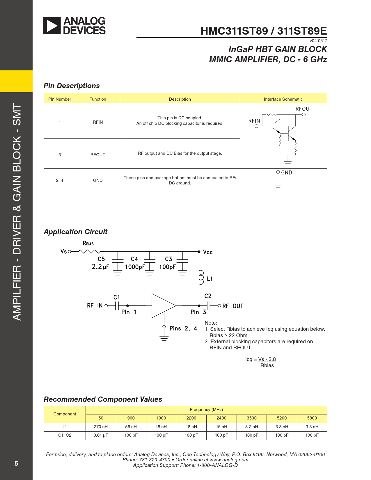 HMC311ST89 / 311ST89E. InGaP HBT GAIN BLOCK. MMIC AMPLIFIER, DC - 6 GHz. Pin Descriptions. Application Circuit