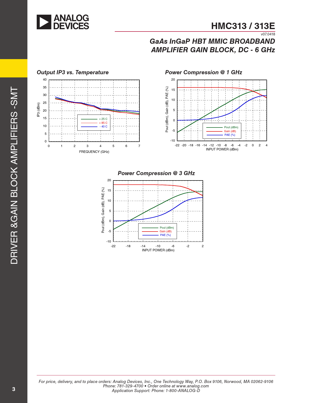 HMC313 / 313E v07.0418 GaAs InGaP HBT MMIC BROADBANDAMPLIFIER GAIN BLOCK, DC - 6 GHzOutput IP3 vs. TemperaturePower Compression @ 1 GHz 40 20 T 35 ) % 15 M ( 30 E A S 10 ), P ) 25 B m d ( S - (dB 20 in 5 a 3 R IP ), G 15 + 25 C m 0 B + 85 C d IE 10 - 40 C t ( u Pout (dBm) o -5 P Gain (dB) 5 PAE (%) LIF 0 -10 P 0 1 2 3 4 5 6 7 -22 -20 -18 -16 -14 -12 -10 -8 -6 -4 -2 0 2 4 INPUT POWER (dBm) M FREQUENCY (GHz) K A C Power Compression @ 3 GHz 20 LO ) % 15 ( E A IN B 10 ), P B d A ( in 5 a G ), G m 0 B d t ( Pout (dBm) u R & o -5 Gain (dB) P E PAE (%) -10 IV -22 -18 -14 -10 -6 -2 2 R INPUT POWER (dBm) D For price, delivery, and to place orders: Analog Devices, Inc., One Technology Way, P.O. Box 9106, Norwood, MA 02062-9106 Phone: 781-329-4700 • Order online at www.analog.com 3 Application Support: Phone: 1-800-ANALOG-D