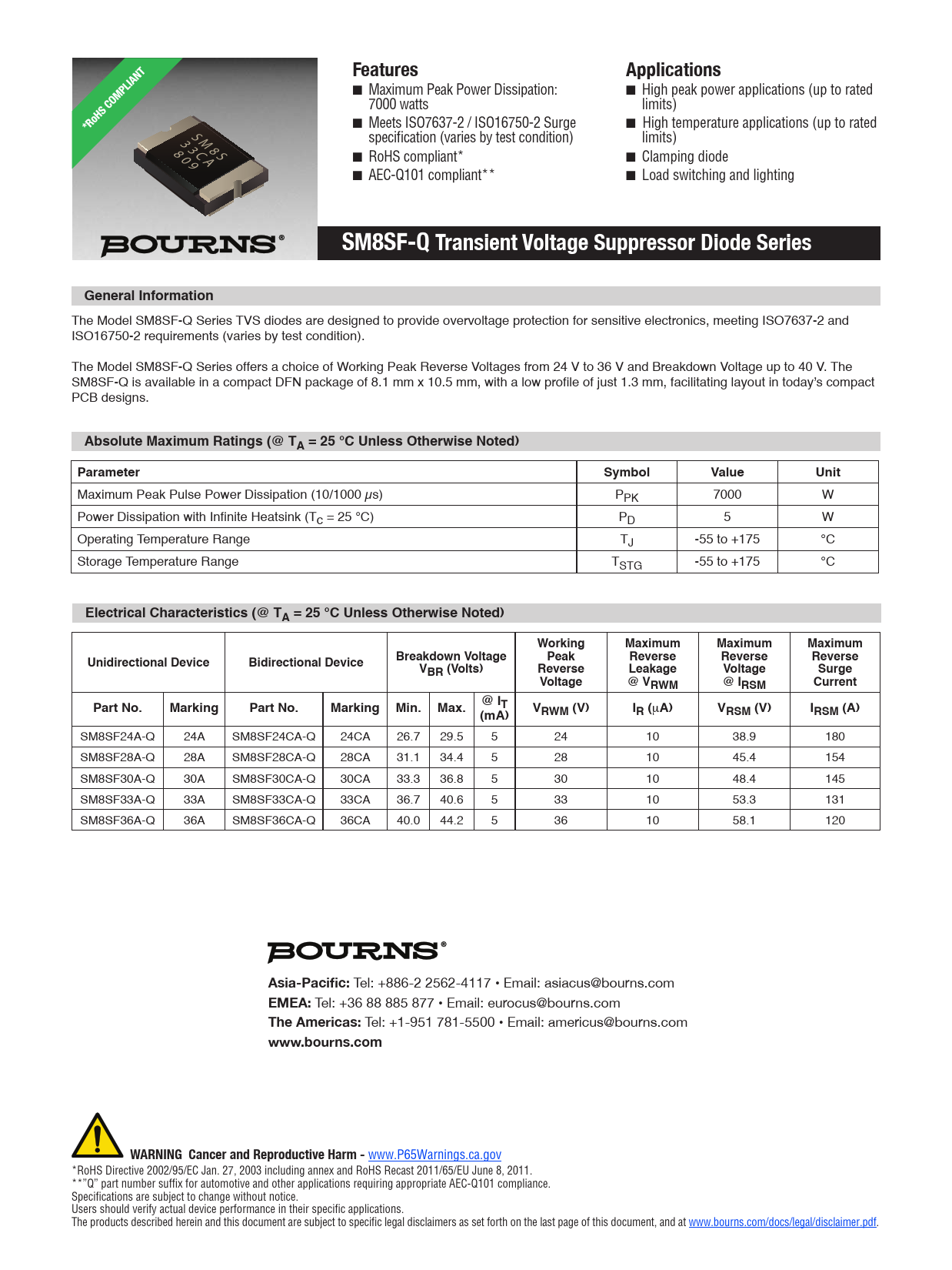 www.P65Warnings.ca.gov *RoHS Directive 2002/95/EC Jan. 27, 2003 including annex and RoHS Recast 2011/65/EU June 8, 2011. **”Q” part number suffix for automotive and other applications requiring appropriate AEC-Q101 compliance. Specifications are subject to change without notice. Users should verify actual device performance in their specific applications. The products described herein and this document are subject to specific legal disclaimers as set forth on the last page of this document, and at www.bourns.com/docs/legal/disclaimer.pdf.