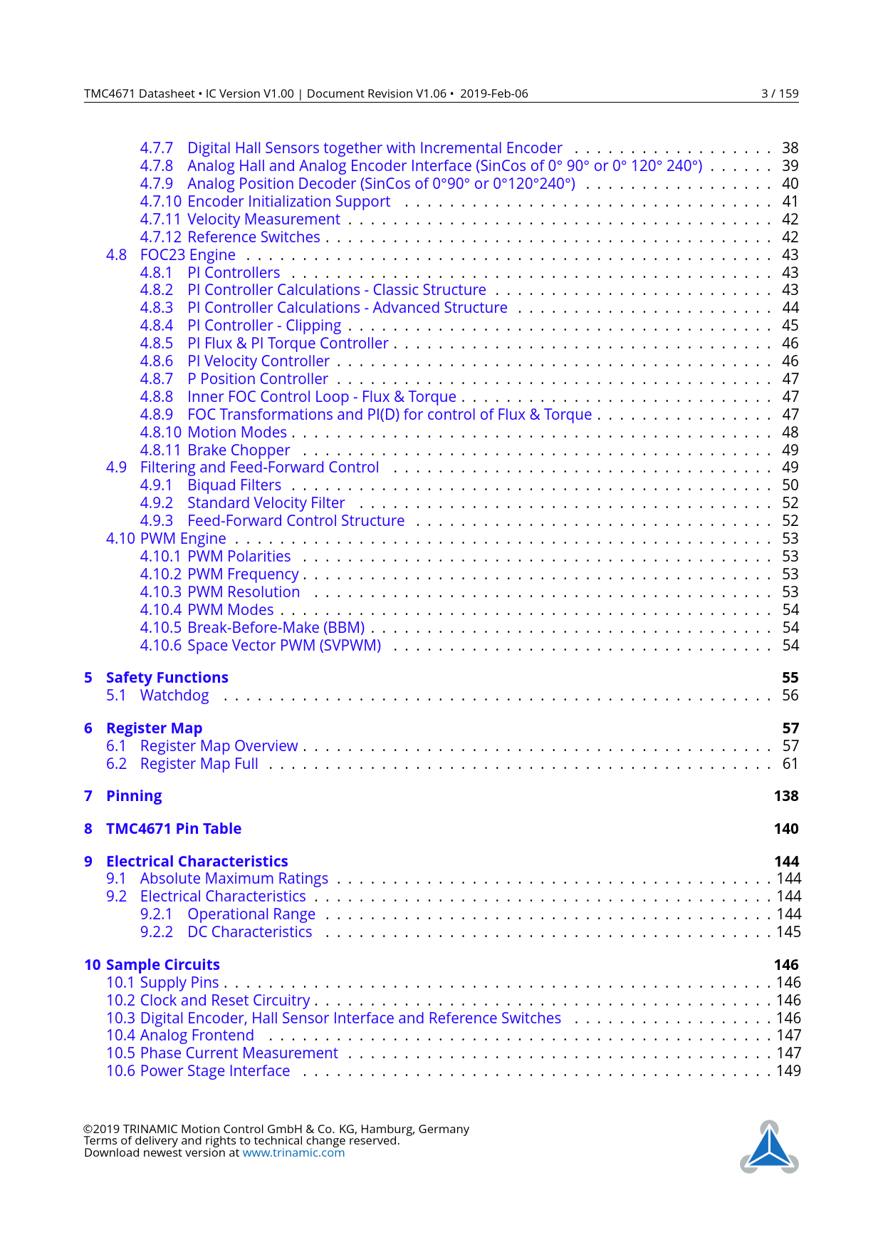 5 Safety Functions. 6 Register Map. 7 Pinning. 138. 8 TMC4671 Pin Table. 140. 9 Electrical Characteristics. 144. 10 Sample Circuits. 146