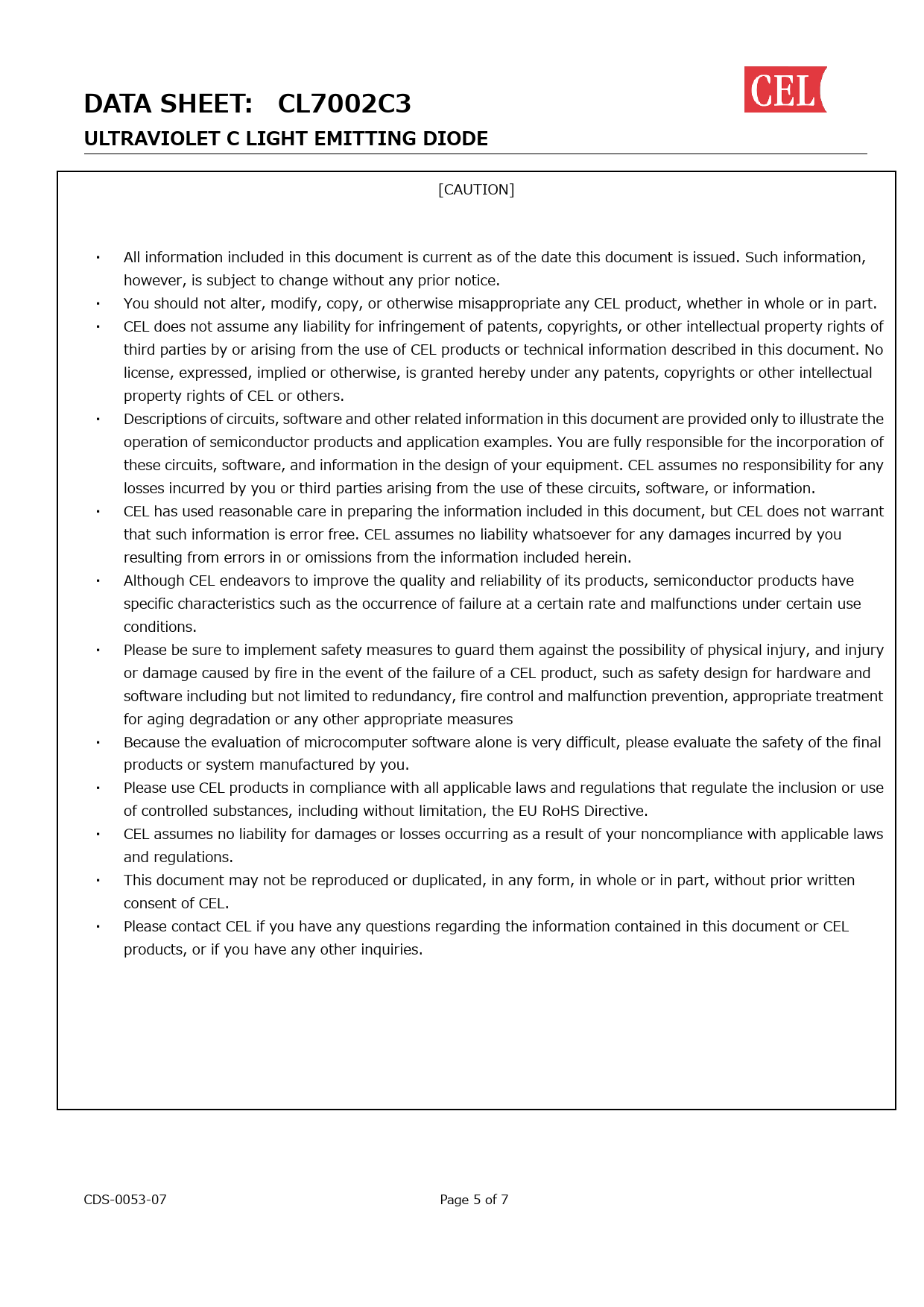 DATA SHEET: CL7002C3ULTRAVIOLET C LIGHT EMITTING DIODE [CAUTION] ・ All information included in this document is current as of the date this document is issued. Such information, however, is subject to change without any prior notice. ・ You should not alter, modify, copy, or otherwise misappropriate any CEL product, whether in whole or in part. ・ CEL does not assume any liability for infringement of patents, copyrights, or other intellectual property rights of third parties by or arising from the use of CEL products or technical information described in this document. No license, expressed, implied or otherwise, is granted hereby under any patents, copyrights or other intellectual property rights of CEL or others. ・ Descriptions of circuits, software and other related information in this document are provided only to illustrate the operation of semiconductor products and application examples. You are fully responsible for the incorporation of these circuits, software, and information in the design of your equipment. CEL assumes no responsibility for any losses incurred by you or third parties arising from the use of these circuits, software, or information. ・ CEL has used reasonable care in preparing the information included in this document, but CEL does not warrant that such information is error free. CEL assumes no liability whatsoever for any damages incurred by you resulting from errors in or omissions from the information included herein. ・ Although CEL endeavors to improve the quality and reliability of its products, semiconductor products have specific characteristics such as the occurrence of failure at a certain rate and malfunctions under certain use conditions. ・ Please be sure to implement safety measures to guard them against the possibility of physical injury, and injury or damage caused by fire in the event of the failure of a CEL product, such as safety design for hardware and software including but not limited to redundancy, fire control and malfunction prevention, appropriate treatment for aging degradation or any other appropriate measures ・ Because the evaluation of microcomputer software alone is very difficult, please evaluate the safety of the final products or system manufactured by you. ・ Please use CEL products in compliance with all applicable laws and regulations that regulate the inclusion or use of controlled substances, including without limitation, the EU RoHS Directive. ・ CEL assumes no liability for damages or losses occurring as a result of your noncompliance with applicable laws and regulations. ・ This document may not be reproduced or duplicated, in any form, in whole or in part, without prior written consent of CEL. ・ Please contact CEL if you have any questions regarding the information contained in this document or CEL products, or if you have any other inquiries. CDS-0053-07 Page 5 of 7
